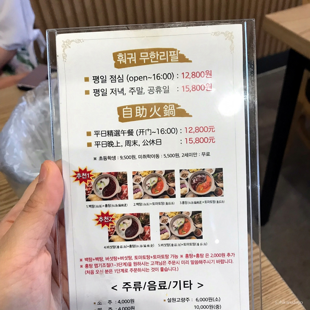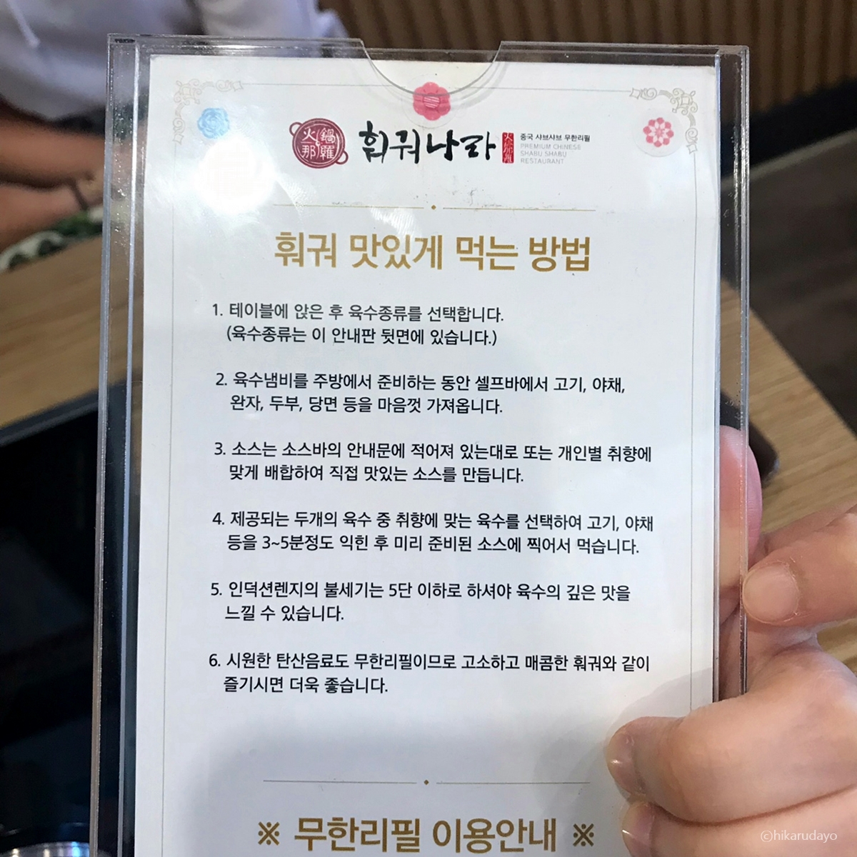 가격은 비싸지 않고, 또 훠궈 맛있게 먹는 방법이 쓰여있어서 초심다가 먹기에 어렵지 않다.