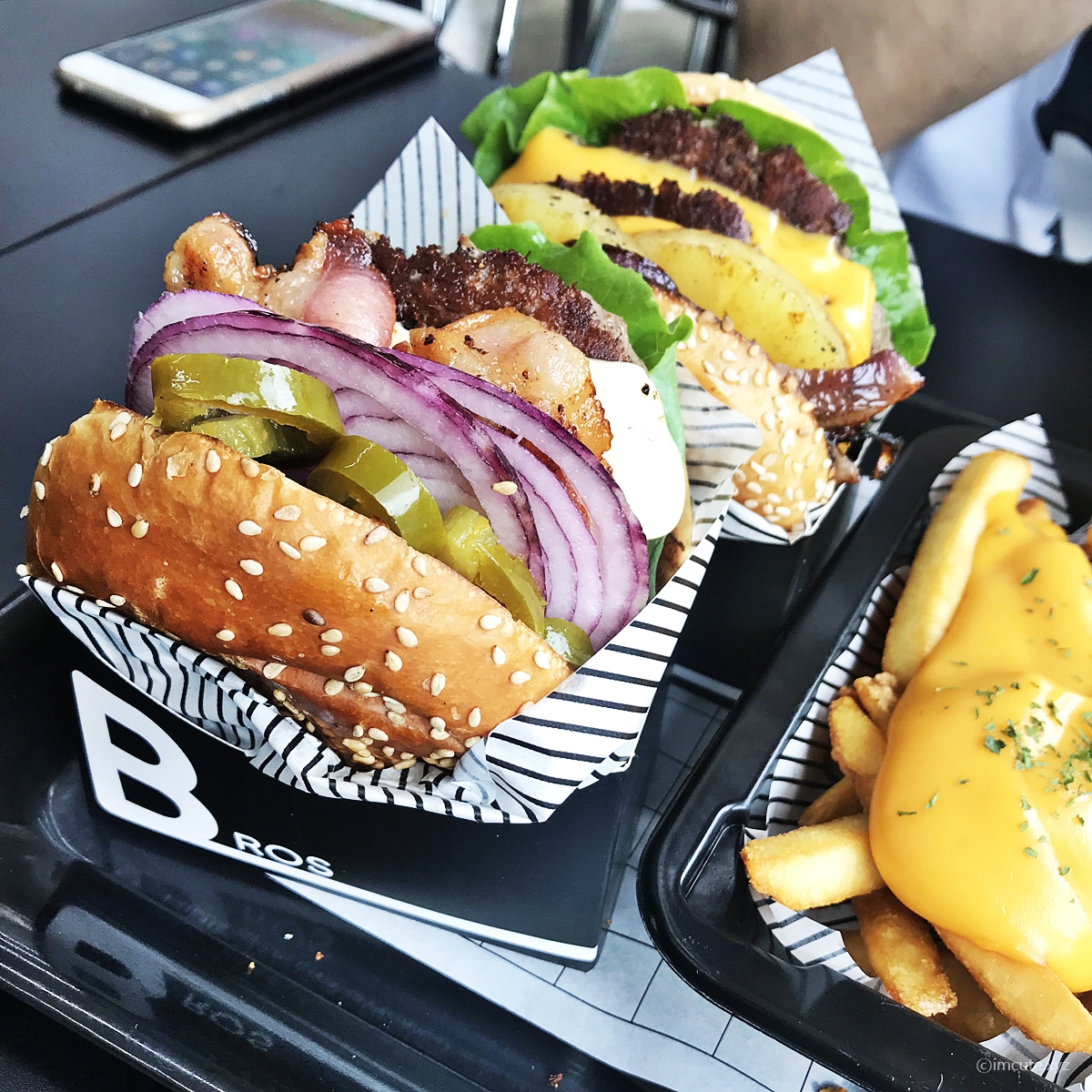 아무래도 브로스버거는 이 근방에서 잘나가는 축에 속하는 맛집 답게, 볼륨감과 비주얼 모든 점을 다 긍정적으로 살린 곳이 아닌가 싶었네요. 흘리지 않게 바닥에 받침대까지 주신 이 센스는..? 그리고 마린룩을 연상시키는 스트라이프 패턴까지 갬성을 다했네요!!