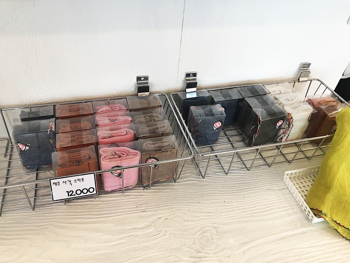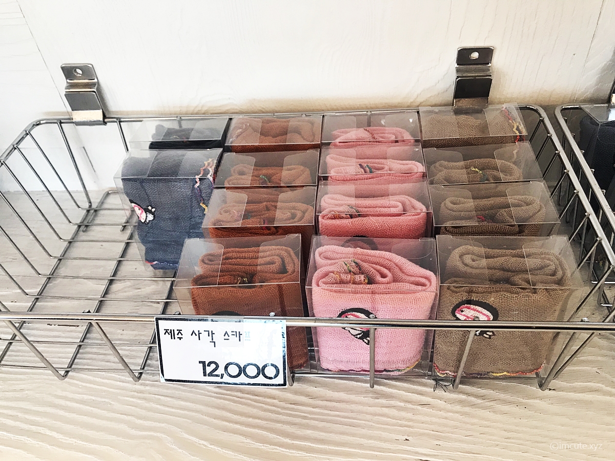 제주 사각 스카프는 살짝 마같은 재질로 되어있어서 통풍이 잘되게 생긴 것이드라고요. 다른 기념품들도 너무 이뻐서 계속 살까말까 망설일 정도였습니다!! 색이 톤다운 된 컬러이면서도 동양적인 느낌이 물씬 했습니다. 이래서 사람들이 여기서 제주 기념품 지르나봐요.