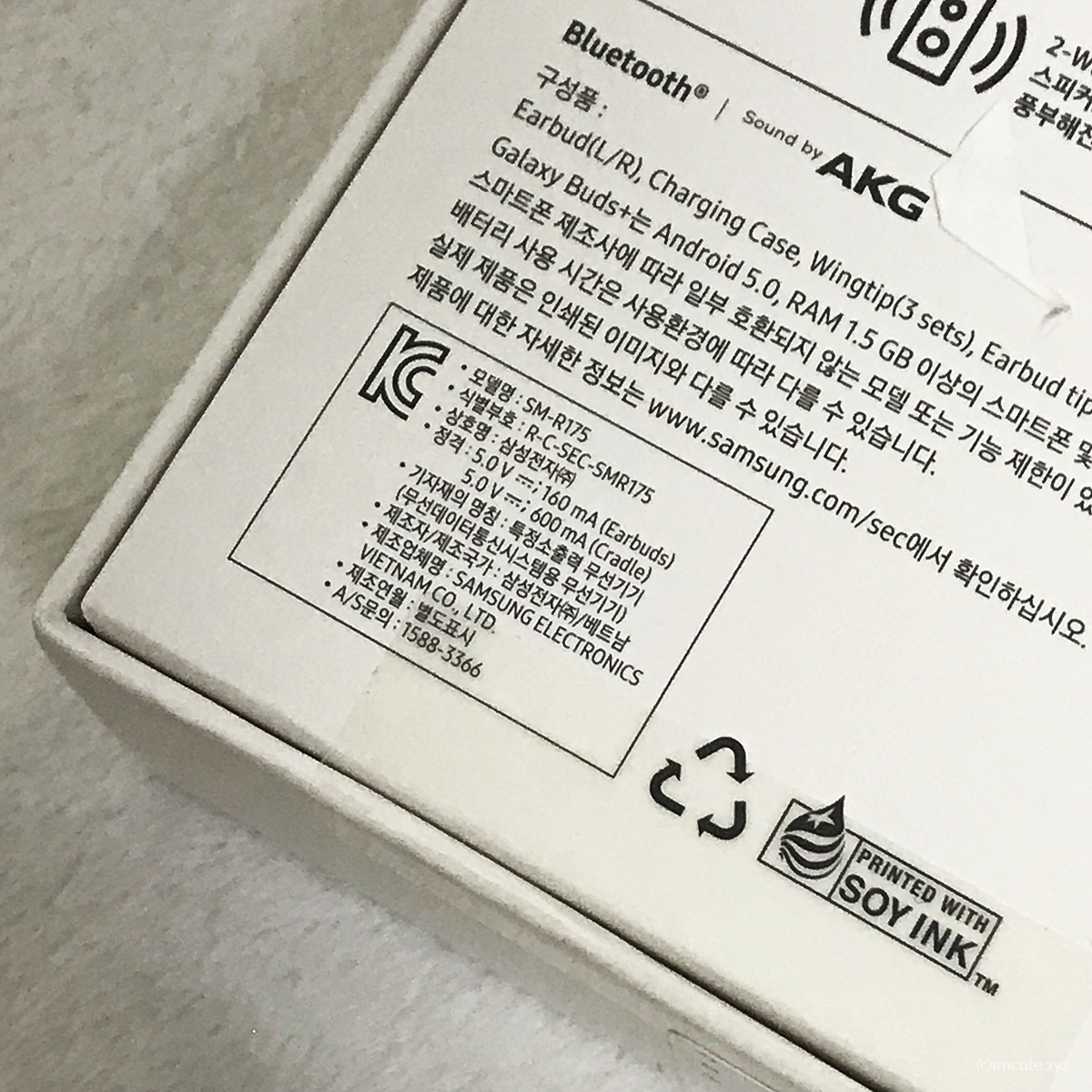 모델명은 SM-R175이고요, 자세한 정보는 삼성 공식홈페이지에서 확인이 가능하다고 하네요. 정격은 5.0V, 160mA(이어버즈)이고요. 600mA의 크래들입니다. 이 기기의 명칭은 특정소출력 무선기기라 하는데요 무선데이터통신시스템용 무선기기이니까 선 없이도 동작한다, 그런 의미라고 보면 되겠습니다. 삼성전자에서 제조가 된것이라고 해도, 메이드인 베트남이네요. 뭔가 신기합니다! 그래도 삼성은 다국적 기업이니 우리나라 것입니다. 설명은 SOY INK로 찍혀져있네요.