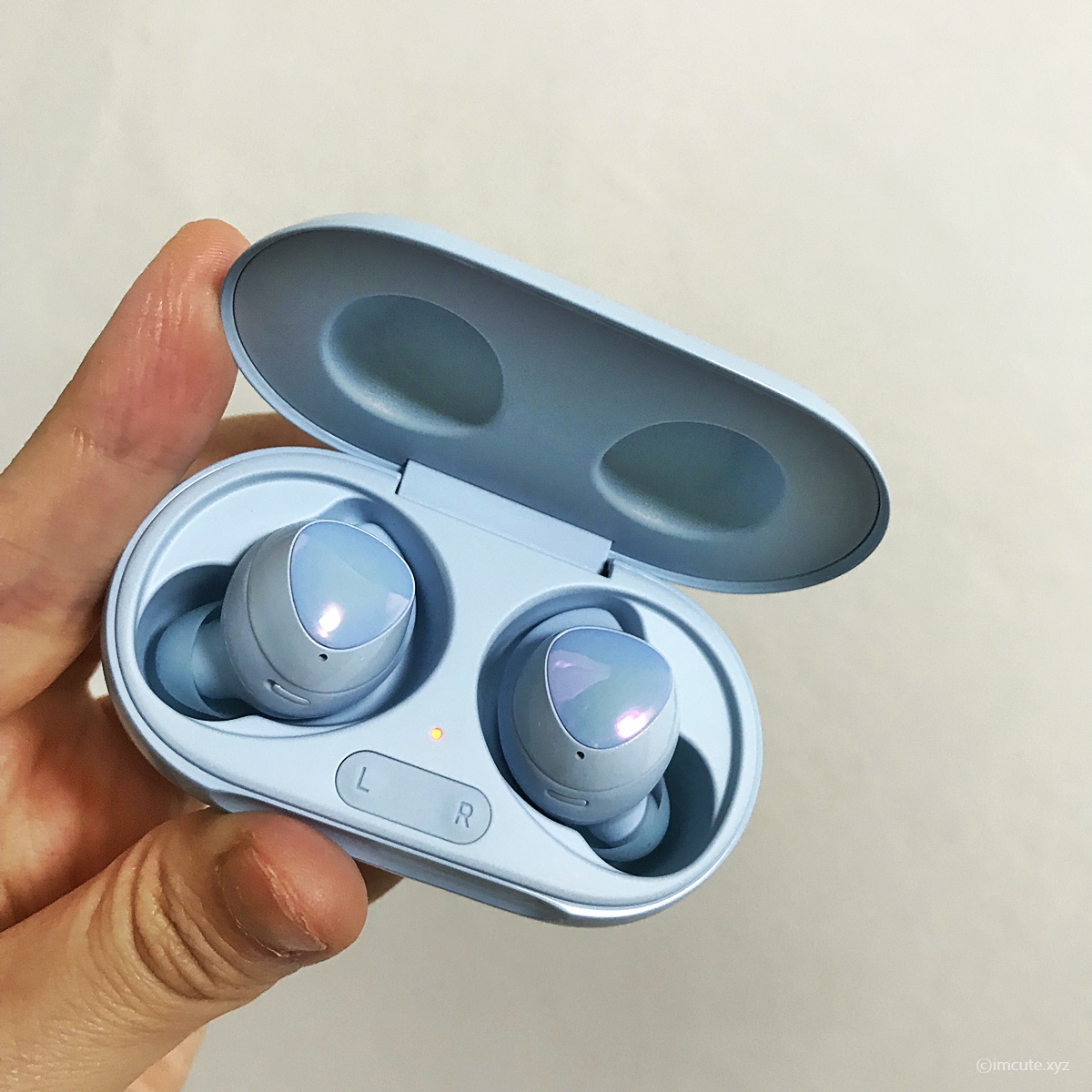 살짝 곡선진 디자인이 너무나도 우주에서 온거 같은 세련됨을 보여줍니다. 전자기기이지만 부드러운 느낌을 주는 것은 왜일까요. L R이렇게 써있어서 마치 렌즈통같기도 합니다. 어쩜 이렇게 이쀼리한 하늘색으로 잘 뽑혔는지~ 애니메이션 토이스토리에 나오는 장난감같이 생겼습니다. 충전은 기본적으로 어느정도 된 상태로 나왔지만 반드시 충전을 더 해줘야합니다.