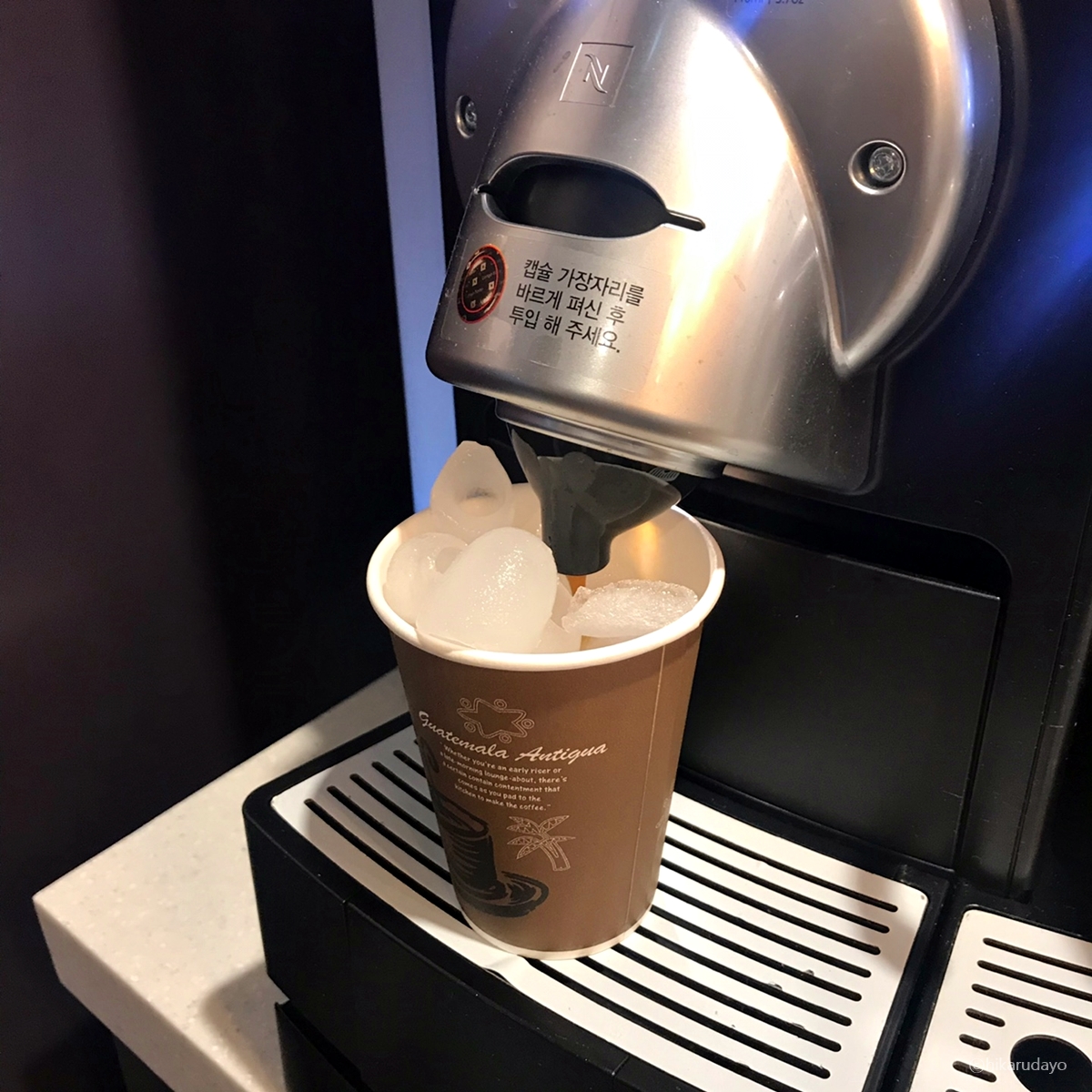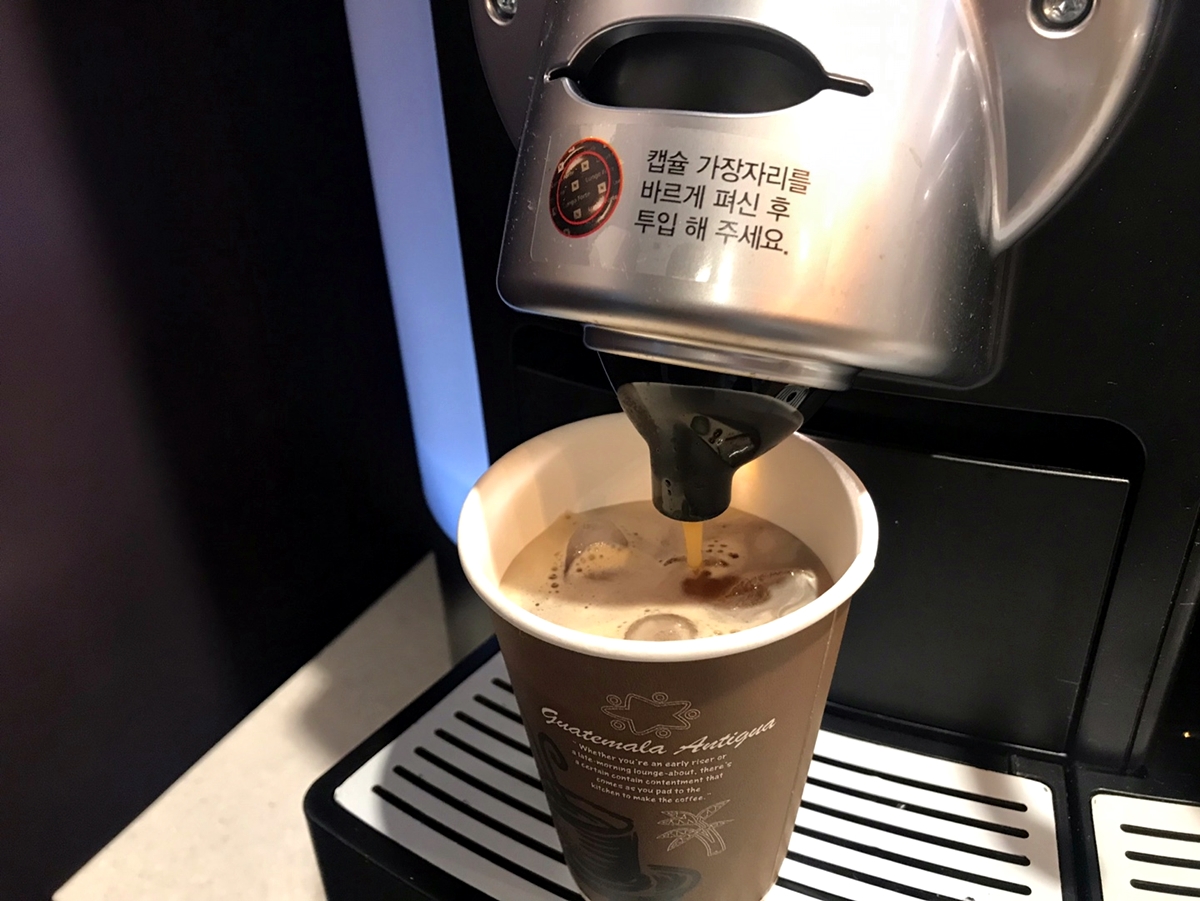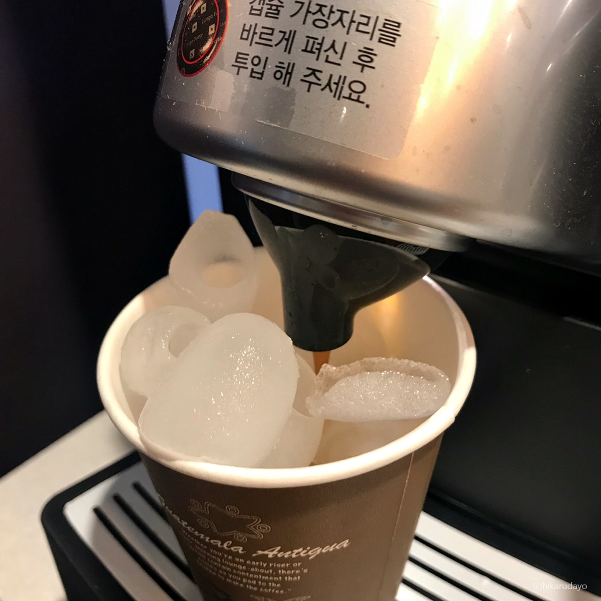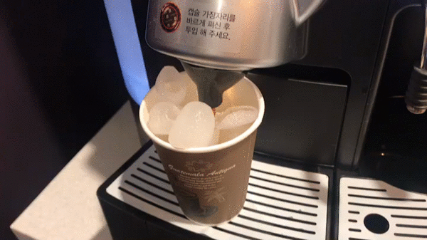 버튼을 누르면 단시간 내로 커피가 추출된다. 얼음이 뜨거운 물에 녹아서 이내 달각거리듯 작아진다.