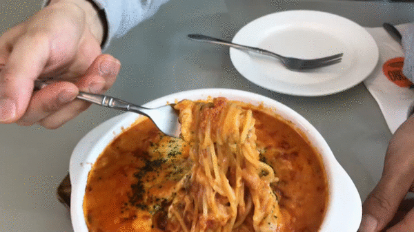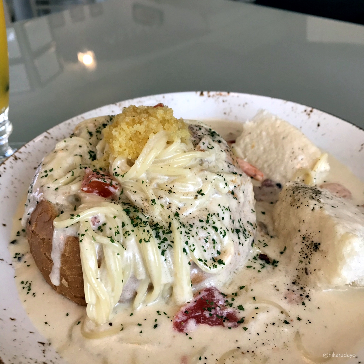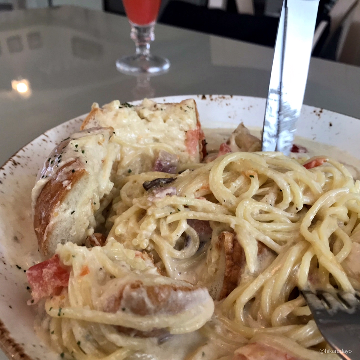 토핑이 끝내주는 장면, 안에는 칵테일 새우라든가, 토마토도 잔뜩 들어있고 무엇보다 내가 좋아하는 파슬리 고명을 촤르륵 뿌려줘서 더욱더 맛난 비주얼이 연출되었다. 그리고 내가 빠네에는 소스가 많은것을 좋아하는데 이건 진짜 풍성하게 먹을것이 많다.