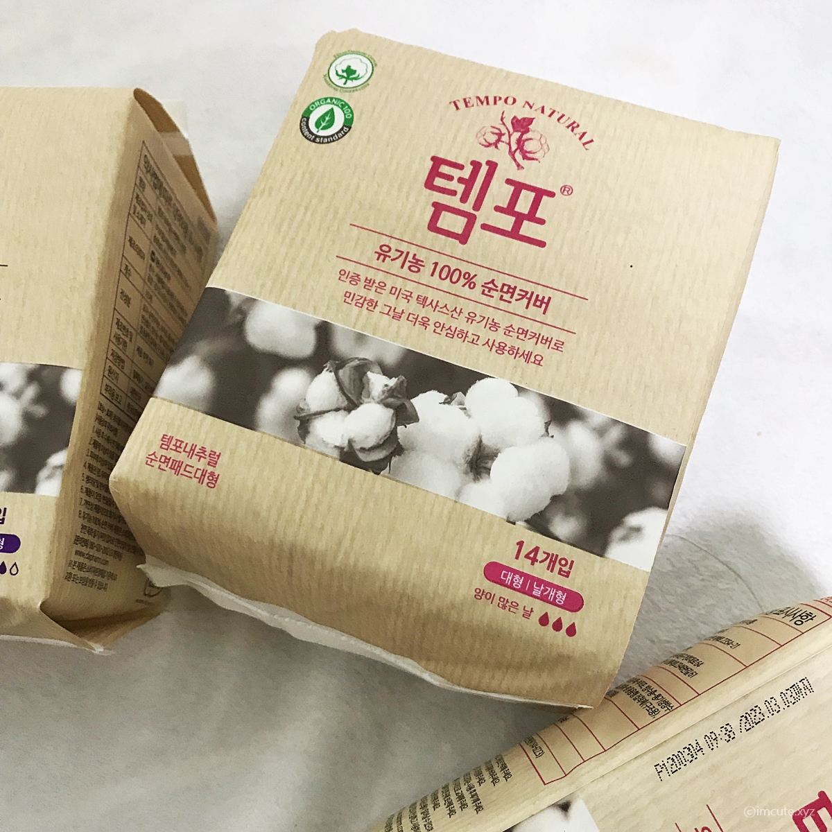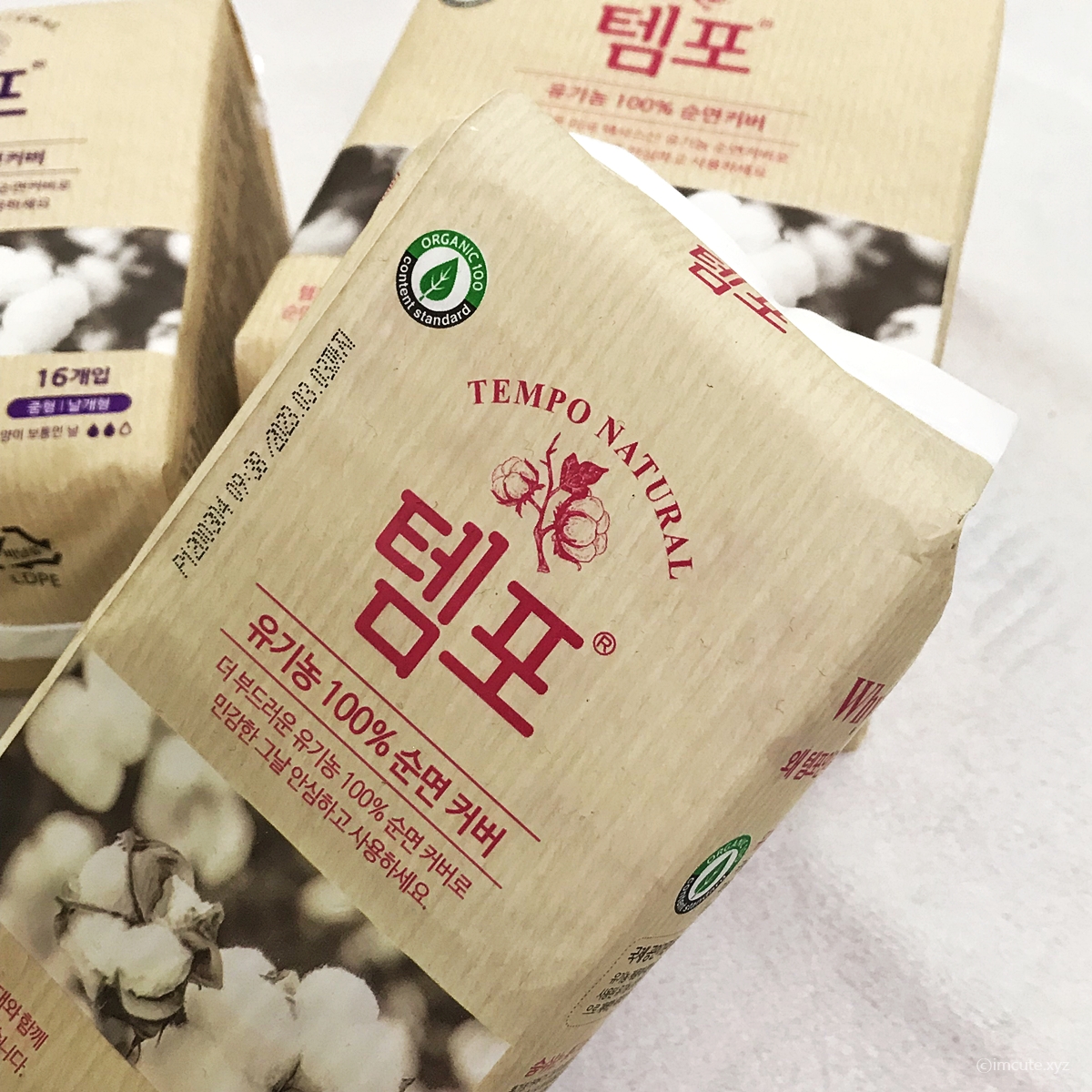 템포 생리대에는 목화로 추정되는 꽃의그림이 그려져있습니다. 아무래도 유기농 100% 순면 커버를 강조하기 위해서 그런거인가봐요. 여러가지 사이즈가 있어서 그날 대비용으로 팬티 라이너, 중형, 대형 이렇게 3가지 사이즈로 사 두시면 좋겠습니다. 처음엔 양이 적어지다가 2-3일째엔 양이 폭발하고 그다음부터 점점 줄어드니 세가지 사이즈가 다 필요하겠지요.