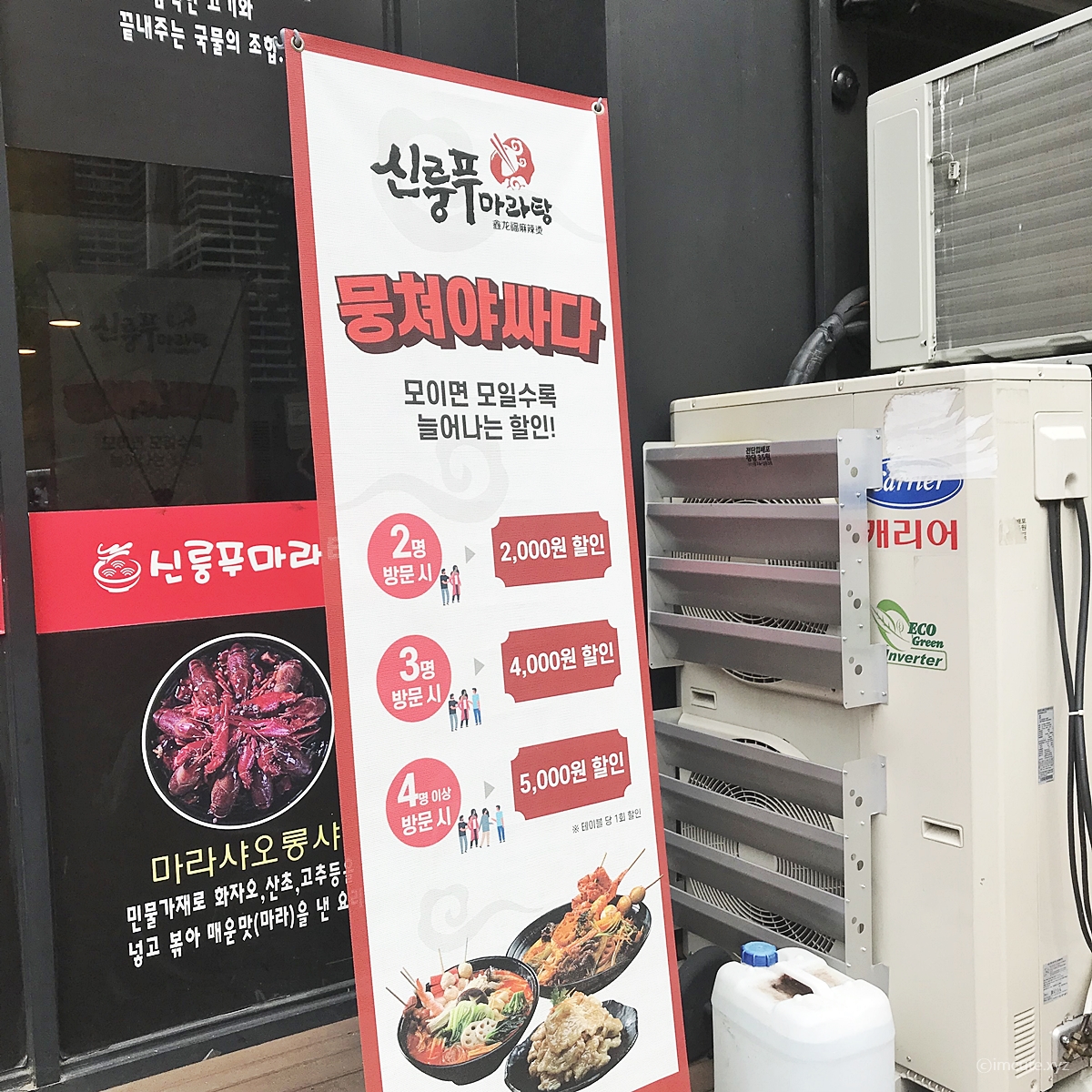 신룽푸마라탕 뭉쳐야 싸다 이벤트입니다. 2명 방문시 2000원 할인, 3명 방문시 4000원 할인, 그리고 4명 이상 방문시 5천원이나 할인이 되는 이벤트를 하고있네요. 처음 맛보시는 분들은 어떤 맛인지 궁금하시다면 이런 기회를 놓치면 아쉽겠습니다.