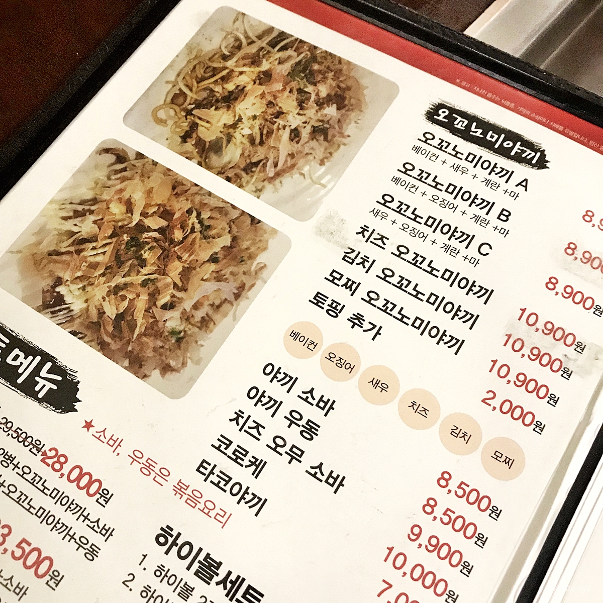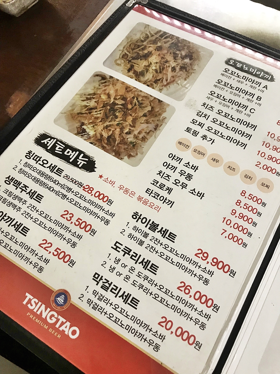 세트로 먹으면 요래요래 저렴합니다. 막걸리세트로 먹었으면 오꼬노미야끼+소바가 단돈 2만원이었군요... 근데 저희는 몬가 하이볼이 먹고싶어서 하이볼2잔에 오꼬노미야끼와 소바로 선택해주엇습니다. 칭따오라든가 타코야끼세트, 생맥주세트도 맛있어 보이고요.