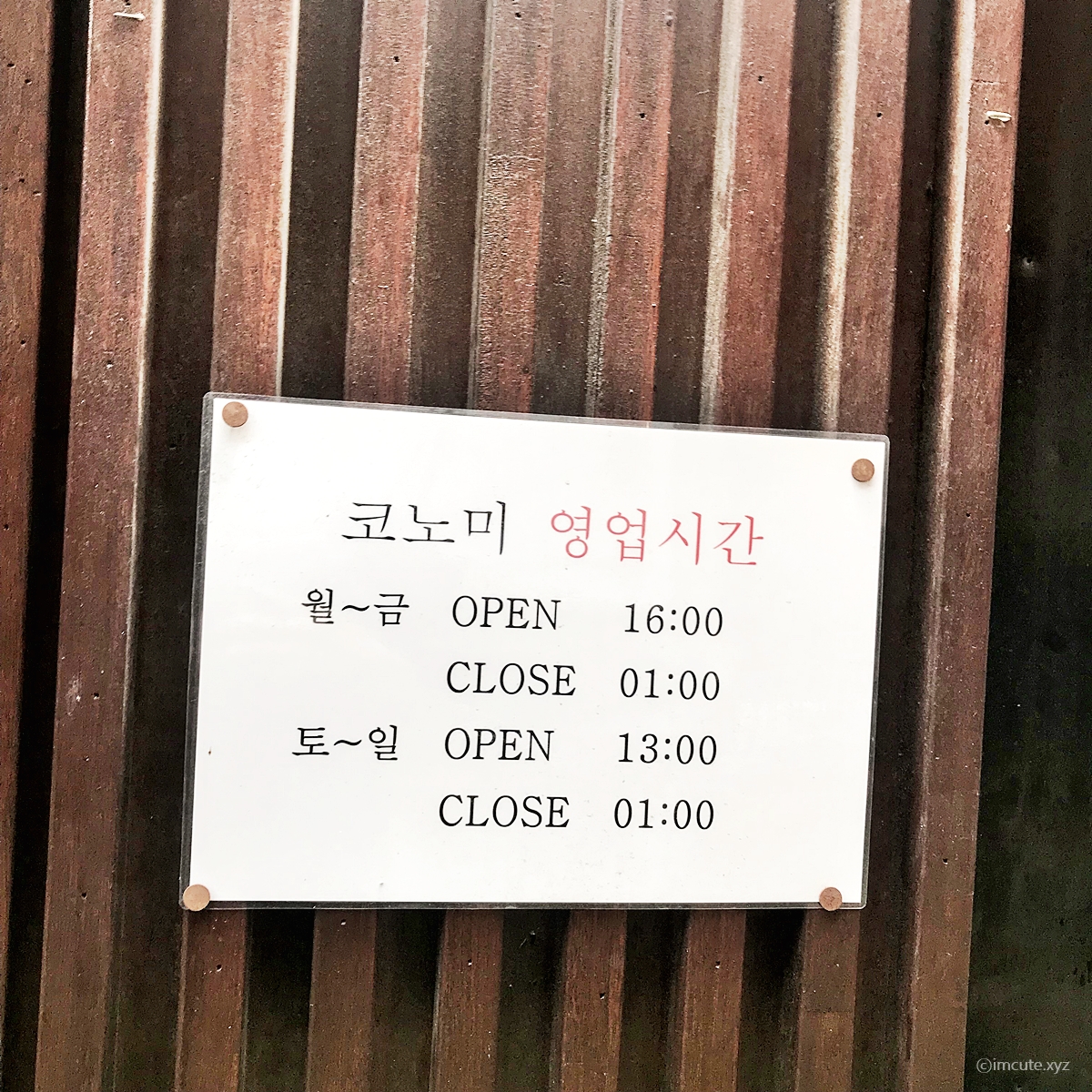 코노미의 영업시간은 월~금 16시부터이고요, 토~일은 1시부터 여네요. 그리고 새벽1시에는 문을 닫으니 그점 유의하시어 찾아 오시면 되겠습니다. 홍대 술집 중에 가격표 보셨다시피 정말 싼 곳이니까 들어와서 한 잔 하세요. 저라면 막차 끊기기 전까지 먹고갑니다 여기서말이죠. 1차를 하고와서 망정이지 몇차 때리고 싶었습니다.흑흑