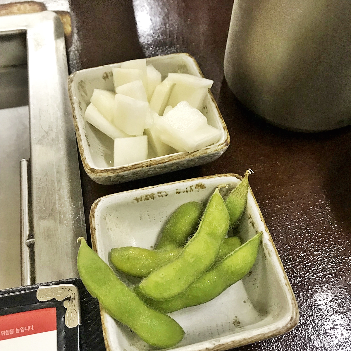 밑반찬입니다. 에다마메(삶은완두콩)이랑 치킨무가 나오더라고요. 오...?둘 다 내가 좋아하는 것이다.