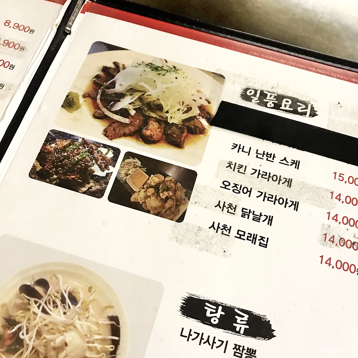 게다가 토핑추가가 따로 되고~ 일품요리 코너에는 카니 난반 스케, 치킨 가라아게, 오징어 가라아게, 사천 닭날개, 모래집이 있었고요. 술집에서 먹는 비쥬얼인 탕류까지..!! 그렇다고 해서 안주가 비싸지 않았는데 홍대 물가 맞아? 싶었습니다. 가격은 최소 5년 전에서 정지된 기분.