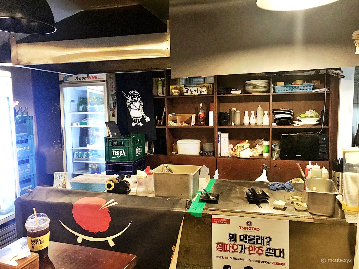 벽에 붙어 있는 흔적들은 홍대생들만의 힙한 분위기도 내주었고요. 역시 홍대는 달라...하면서 이런저런 분위기를 보았습니다. 뭔가 혼자 먹어도 좋은 카운터석도 있고 이래저래 좋더라고요~ 저는 맘에 들었습니다. 이 느낌아니까!! 약간 오사카의 선술집 느낌이 나는듯 했습니다.