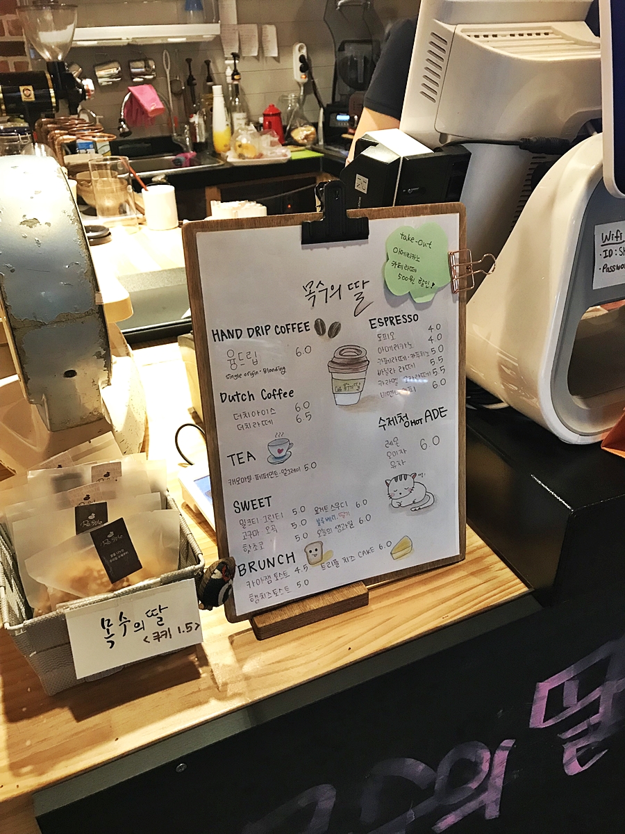 메뉴는 핸드드립 커피부터 시작해서 티, 달달한 음료메뉴, 수제청, 에스프레소 등이 다 있더라구요. 밀크티 그린티, 요거트 스무디, 고구마 오곡, 핫초코, 오늘의 생과일 다 맛나보였어요. 브런치로 토스트라든가 트리플 치즈케이크, 햄치즈토스트도 너무 맛나보였어요. 나중엔 여기서 수제청 에이드로 레몬, 오미자, 유자도 다 즐겨보고싶었어요. 손으로 직접 그린듯한 메뉴판이 진짜 감성있던데 사장님께서 진짜 고양이를 좋아하시나봐요. 저도 그래요! 야옹!