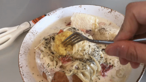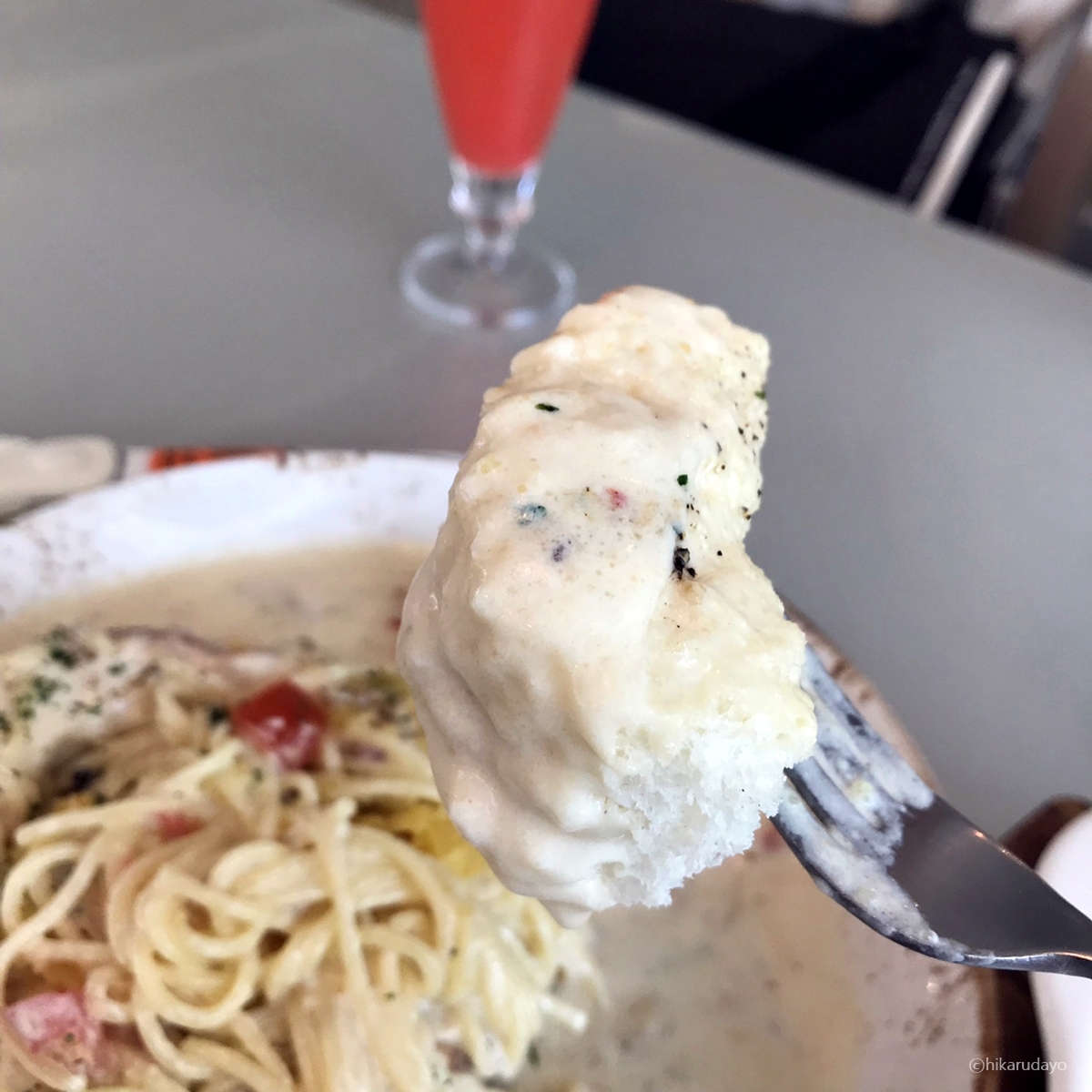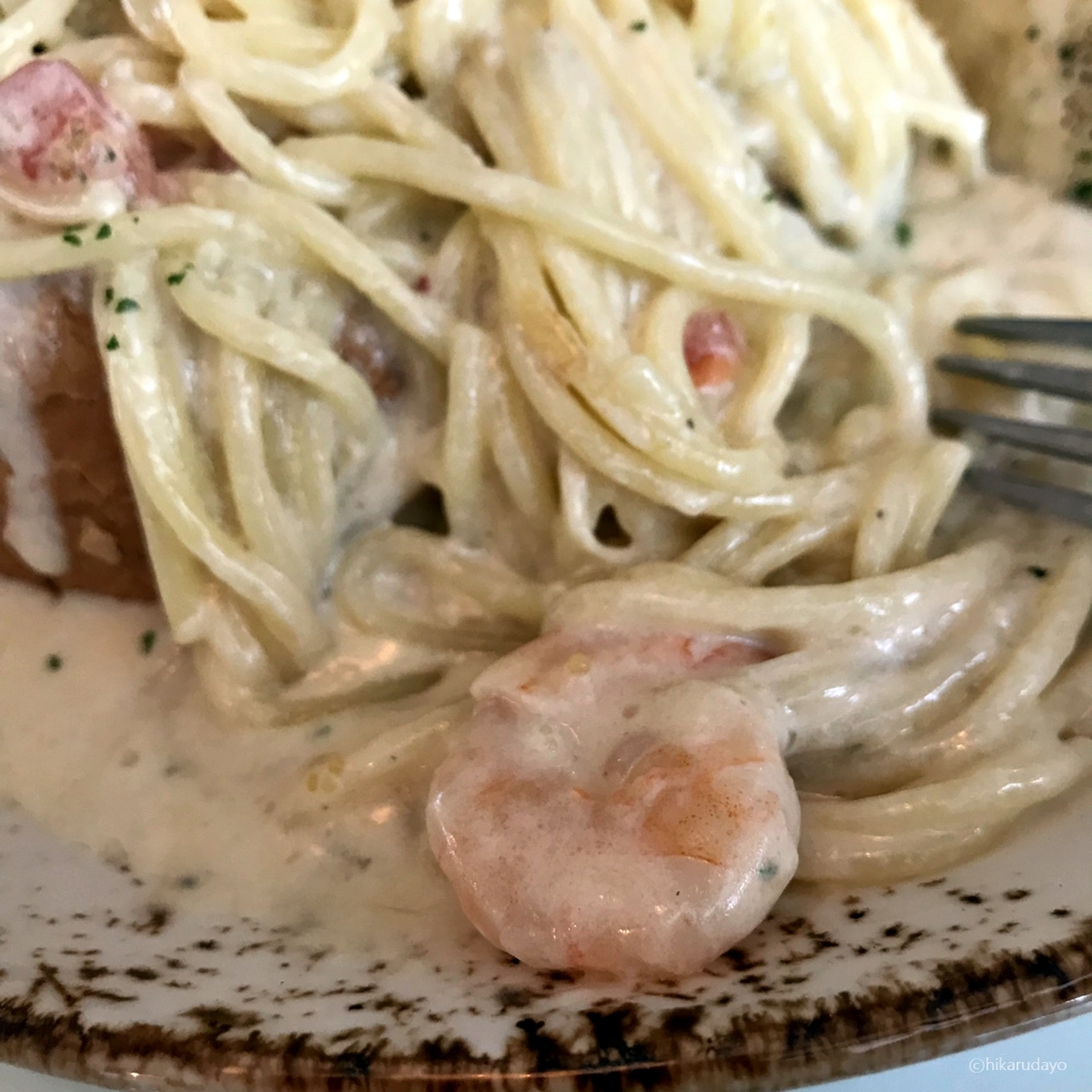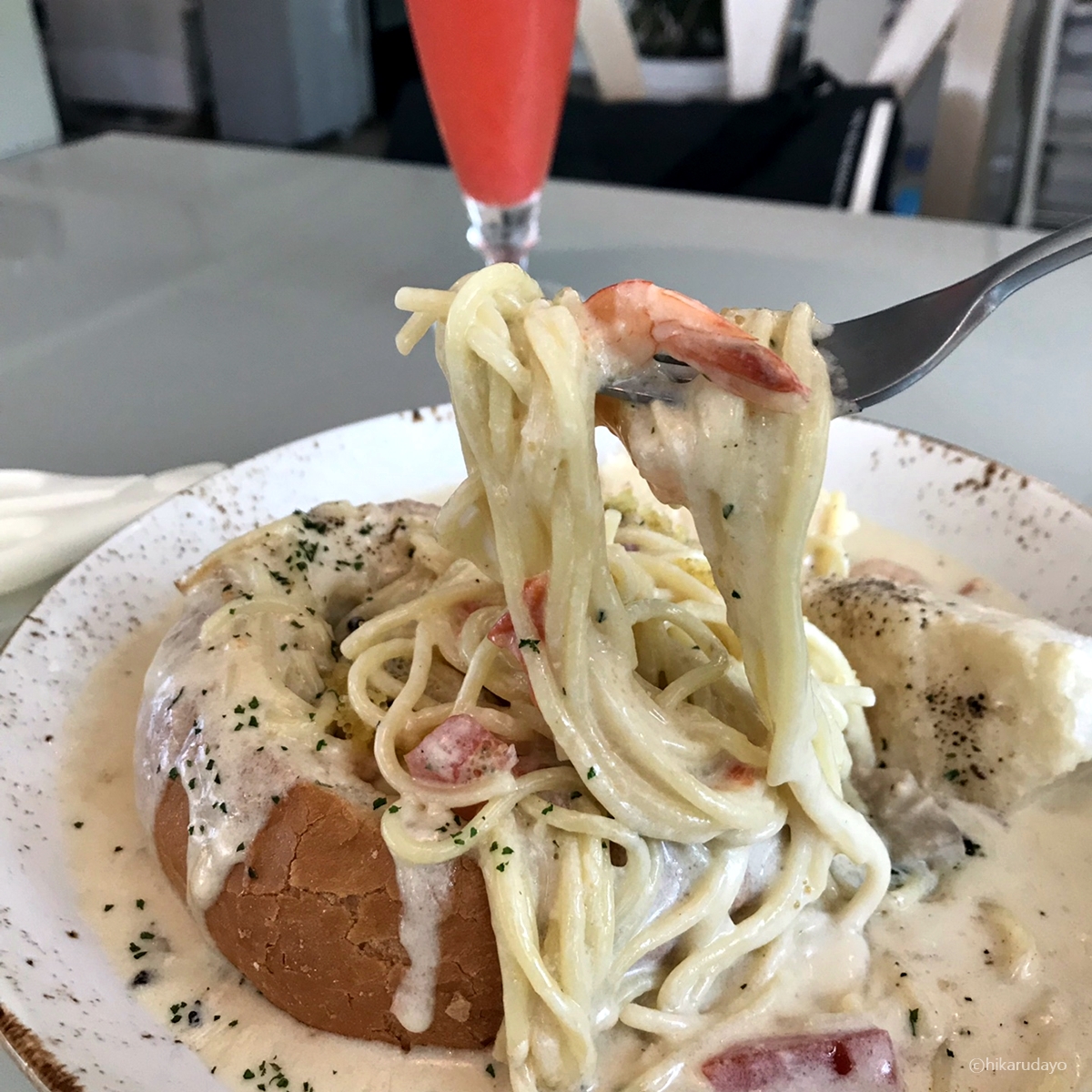 토핑이 끝내주는 장면, 안에는 칵테일 새우라든가, 토마토도 잔뜩 들어있고 무엇보다 내가 좋아하는 파슬리 고명을 촤르륵 뿌려줘서 더욱더 맛난 비주얼이 연출되었다. 그리고 내가 빠네에는 소스가 많은것을 좋아하는데 이건 진짜 풍성하게 먹을것이 많다.