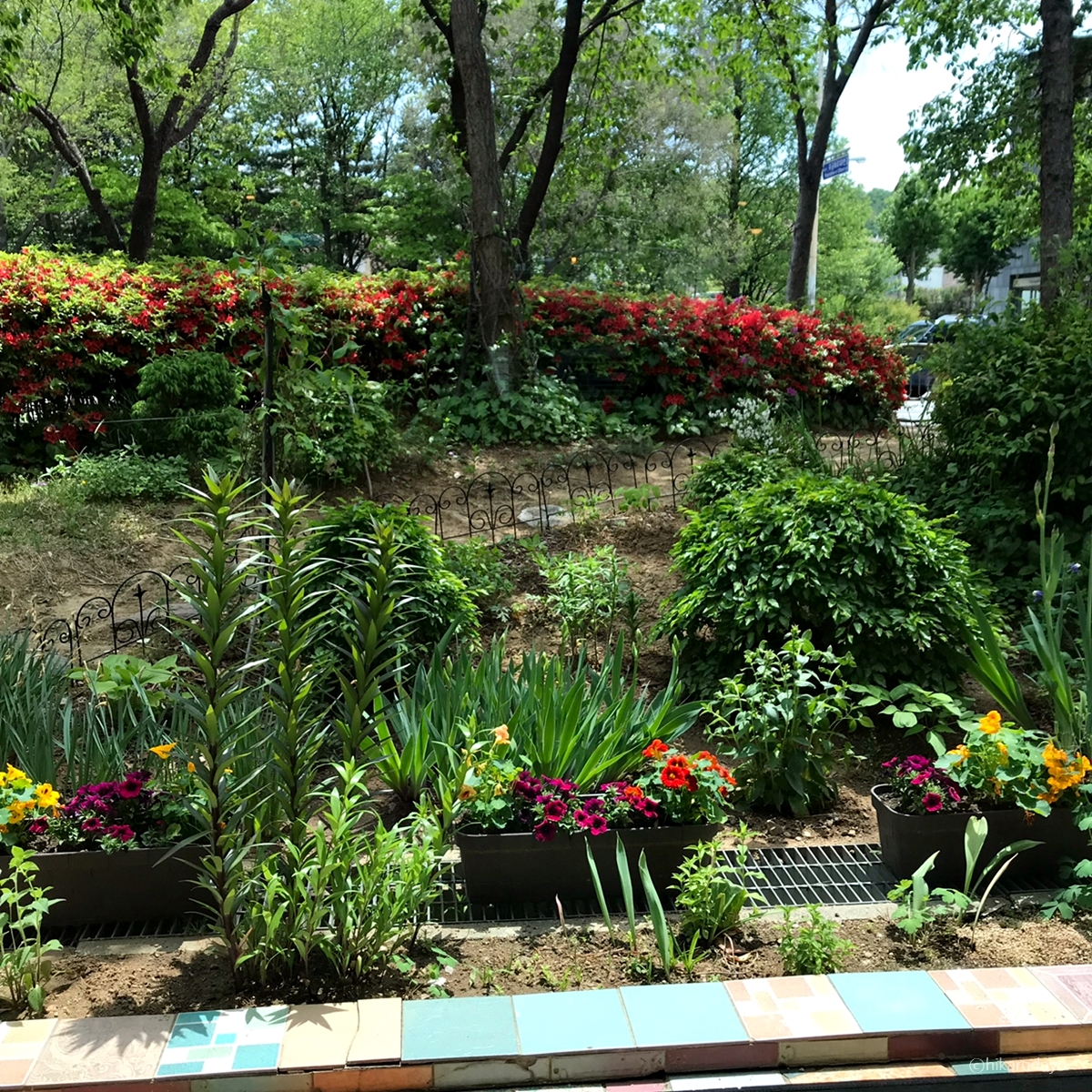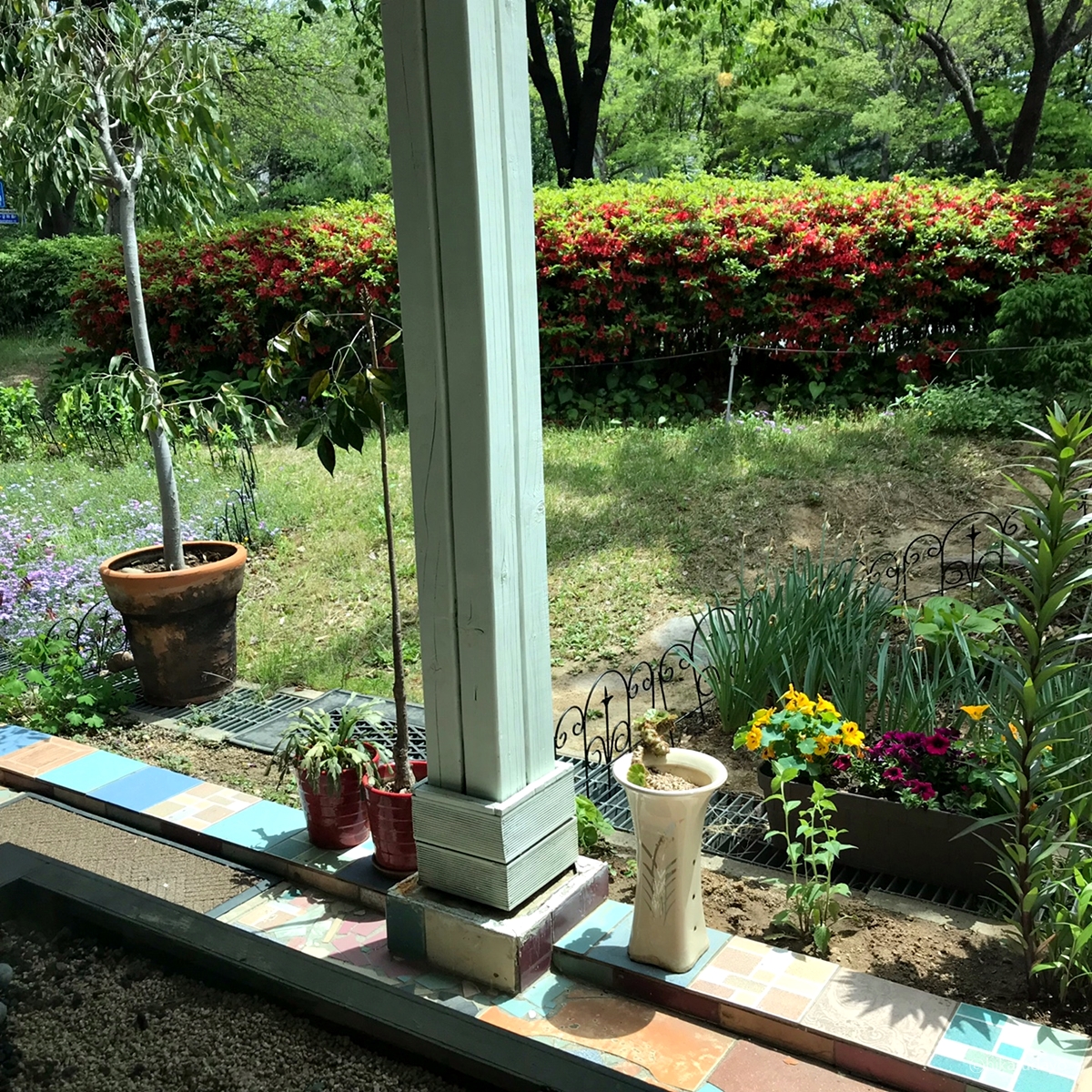 창밖을 보니 화단이 너무나도 이뻤다. 저 뒤쪽으로도 가게내부와 통하는 문이 있었다. 즉 가게 앞, 뒤쪽으로 문이 따로따로인데 단골고객분들은 저쪽으로도 들어오시더라...ㅎㅎㅎ몰랐다.