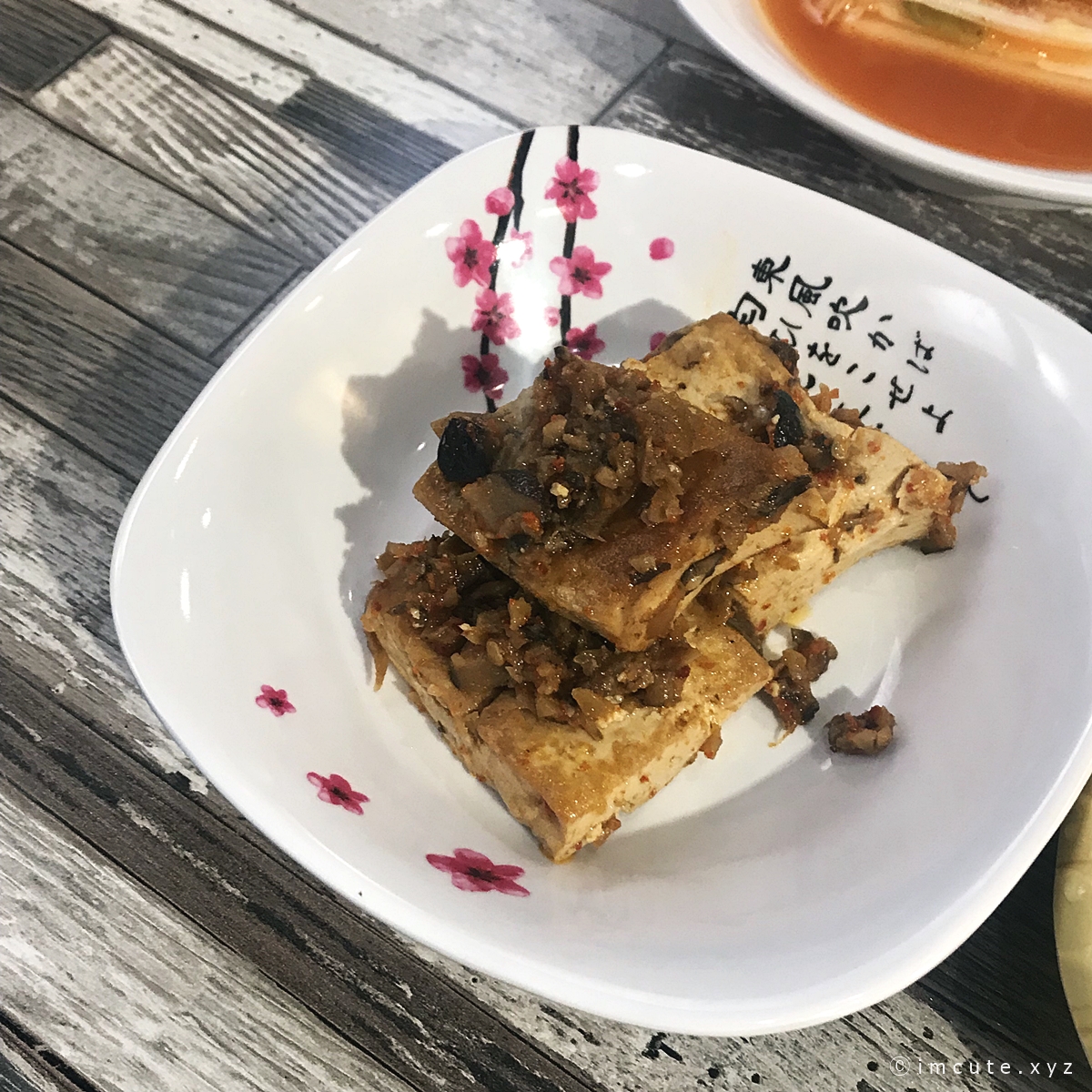 메밀전 찍어먹는 간장, 두부, 그리고 열무김치 반찬입니다.