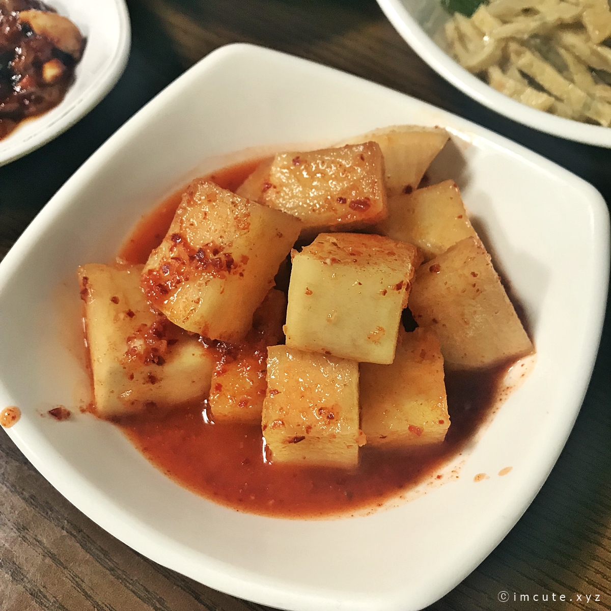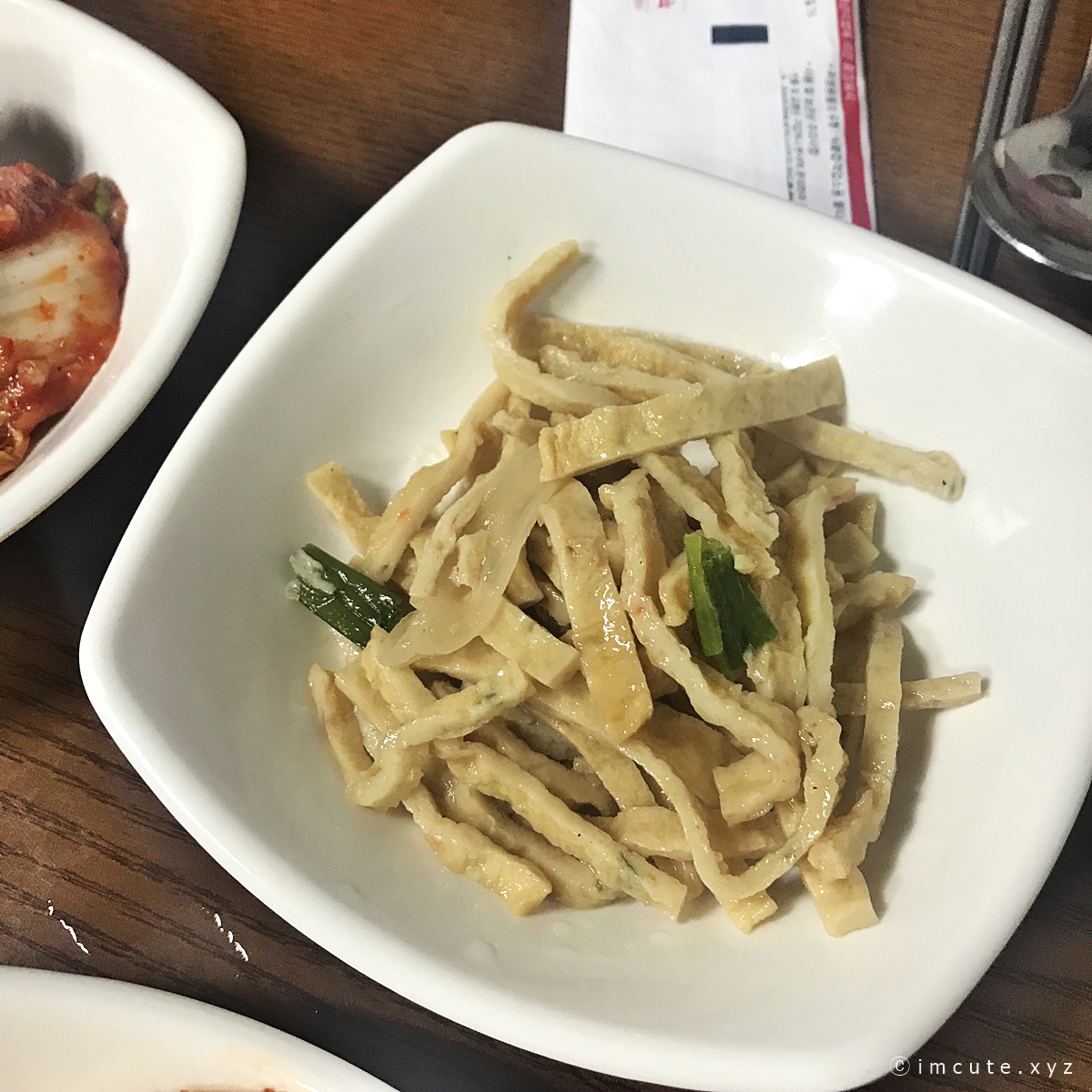 밑반찬으로 오징어장아찌, 김치겉절이, 깍두기, 오뎅볶음이 나옵니다.