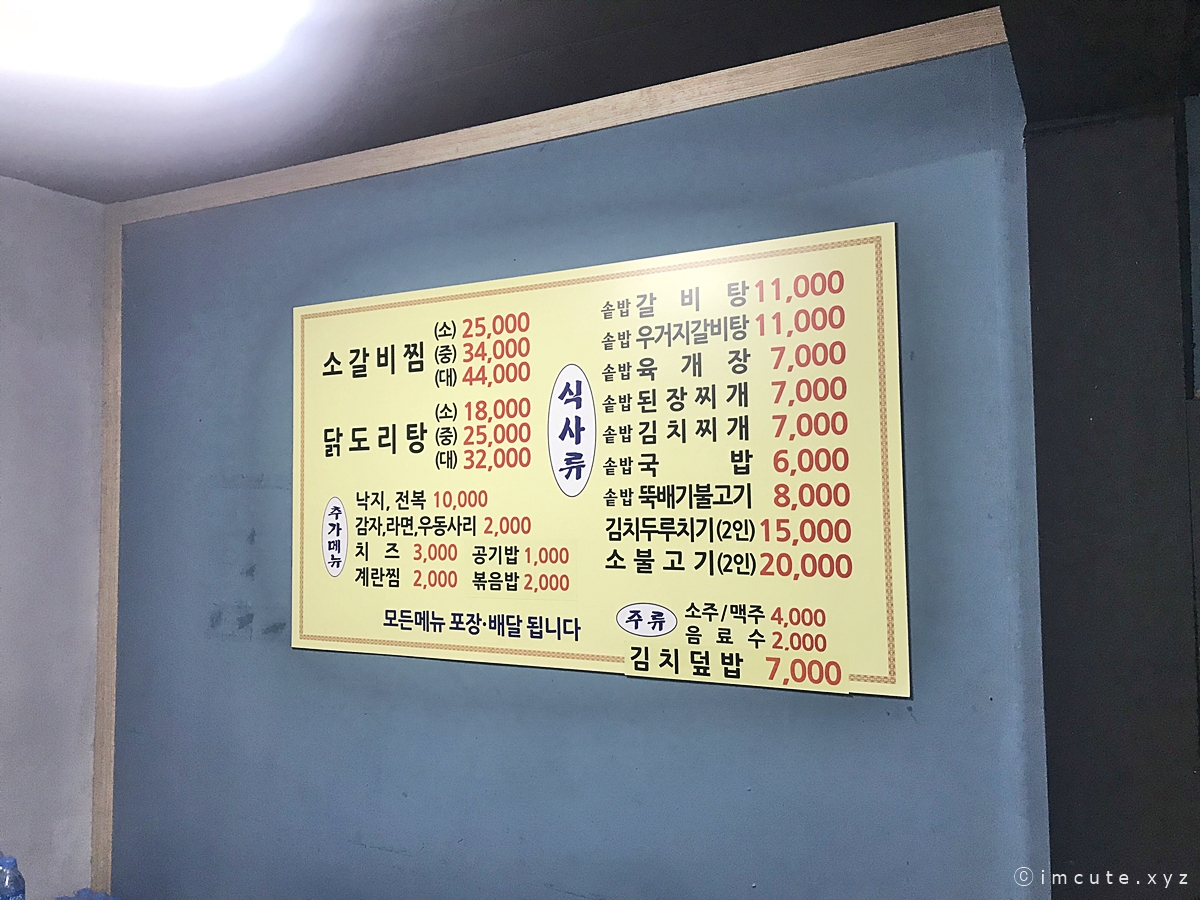 메뉴는 소갈비찜이랑 닭도리탕을 중심으로 나오는거 같어라고요. 소갈비찜 사이즈는 소, 중, 대로 구분되어 있었고요 닭도리탕도 마찬가지였습니다. 대짜도 3~4만원대로 먹을수 있으니 마포구에서 한끼 할 때 가격걱정은 안하셔도 되겠습니다.