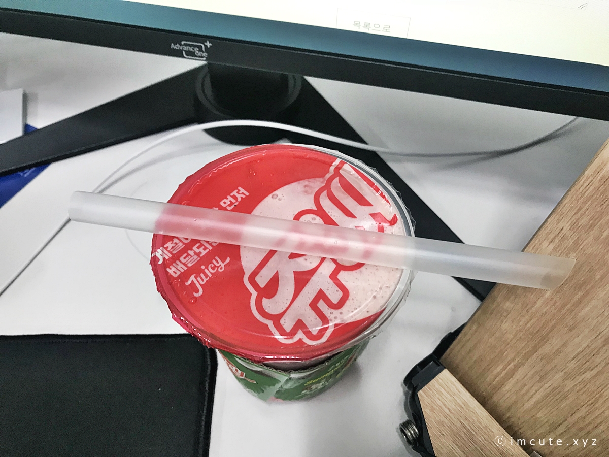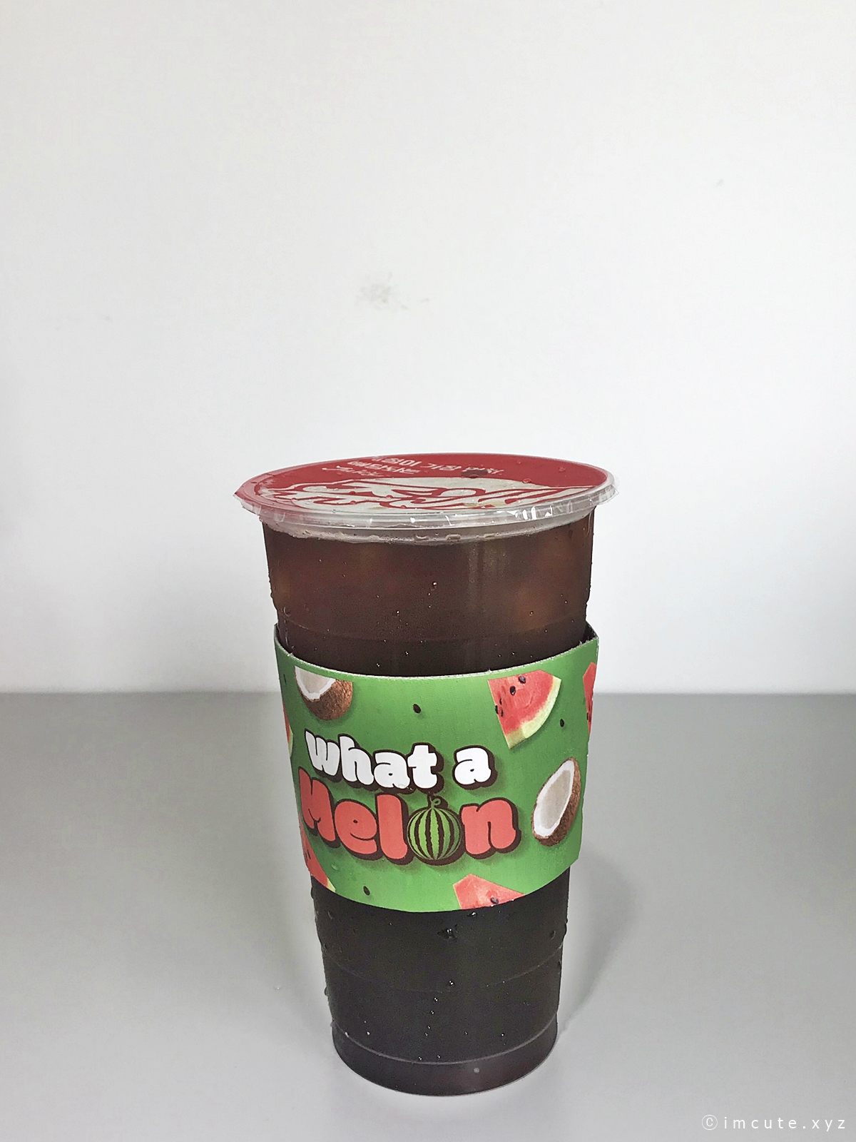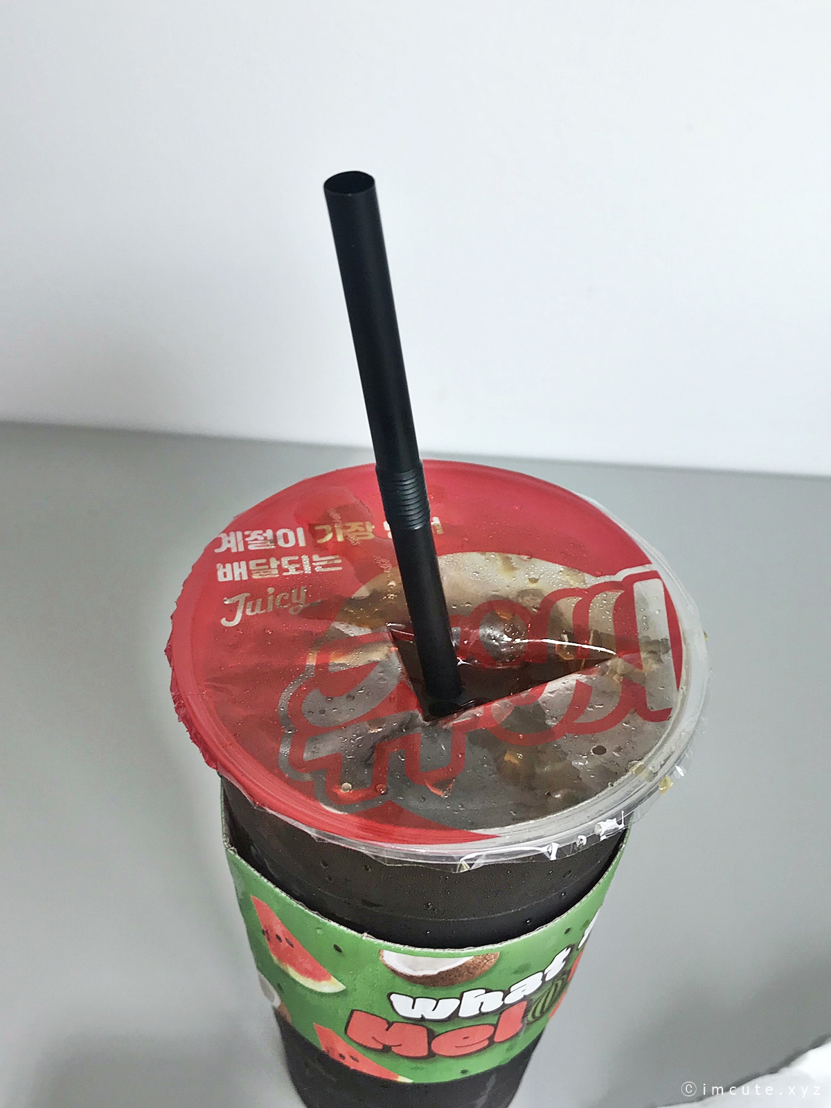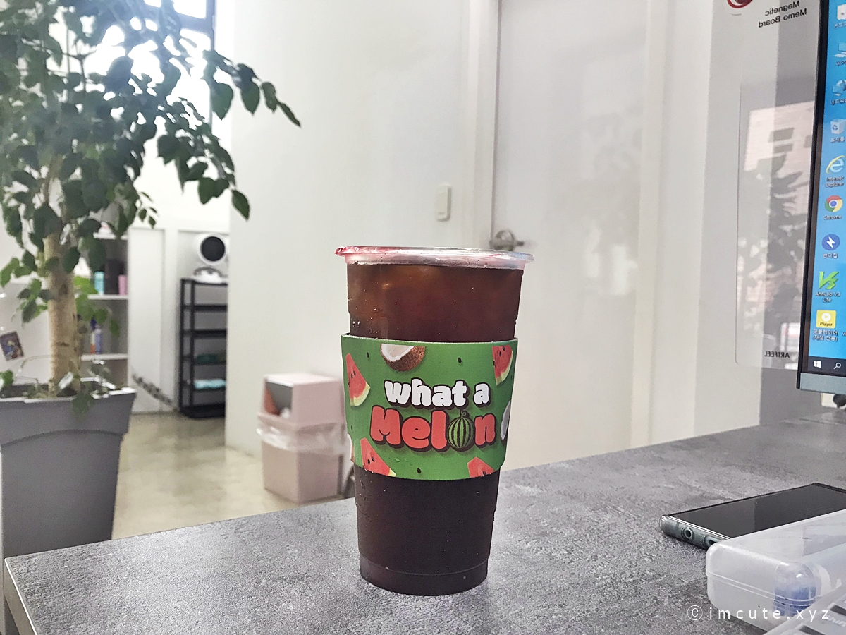 What a melon이라고 써 있는 컵홀더!! 차가워지니까 쫌 불어터졌지만 그래두 너무너무 이쁘죠. 마치 쩐쭈나이차 (버블티)먹을 때처럼 위에 저렇게 막아줘요.