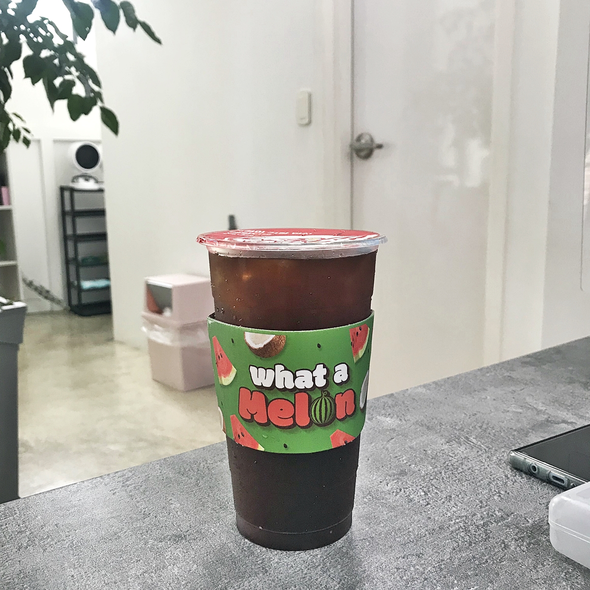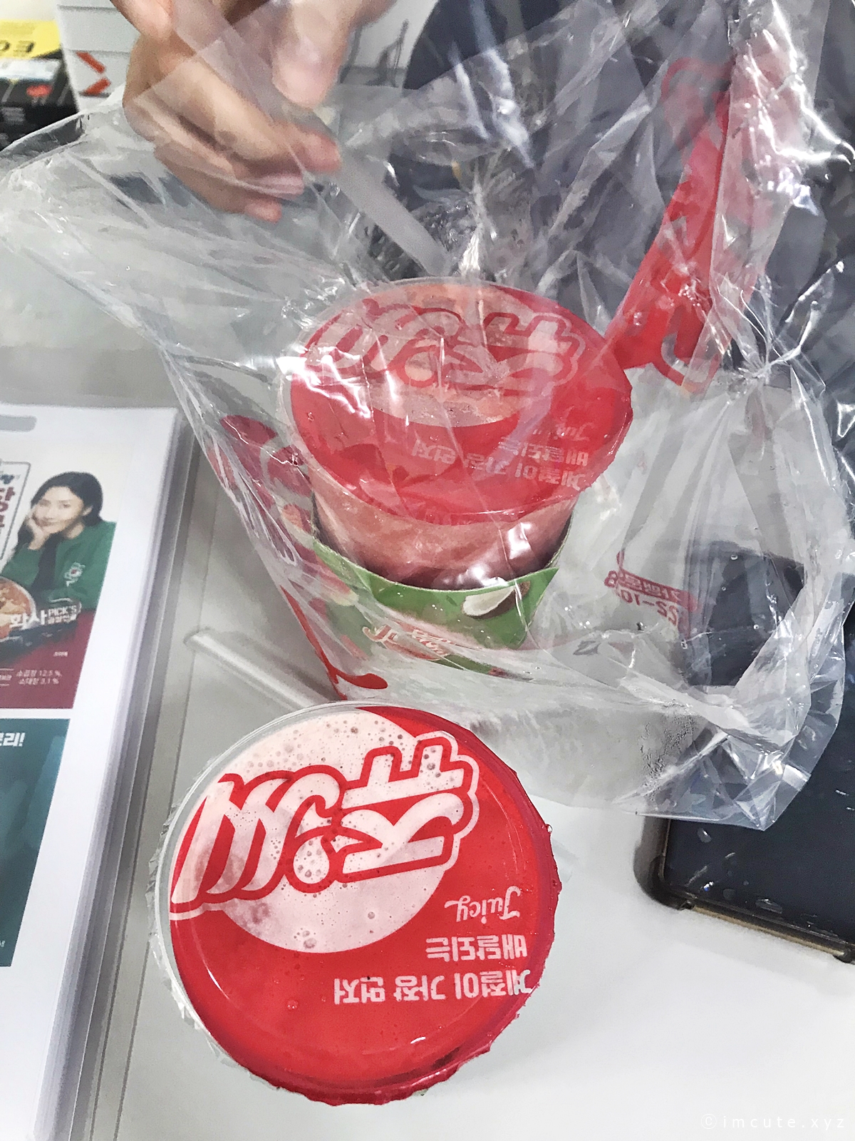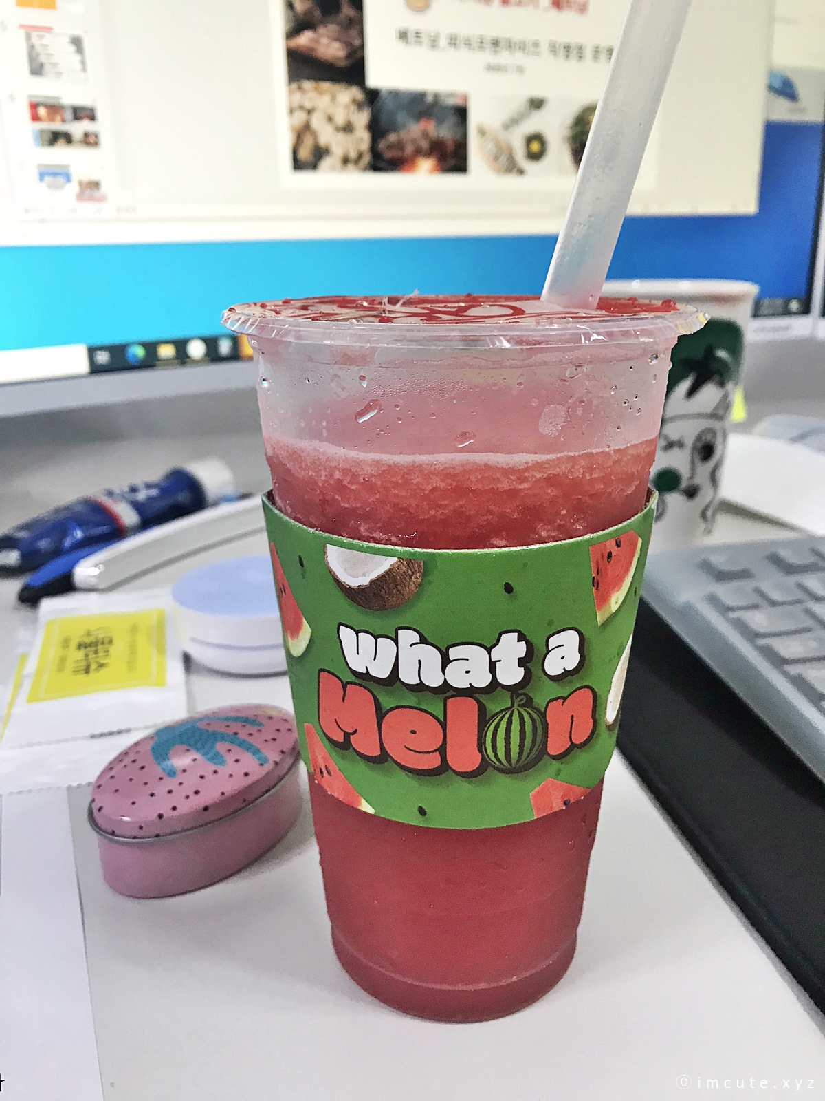 What a melon이라고 써 있는 컵홀더!! 차가워지니까 쫌 불어터졌지만 그래두 너무너무 이쁘죠. 마치 쩐쭈나이차 (버블티)먹을 때처럼 위에 저렇게 막아줘요.