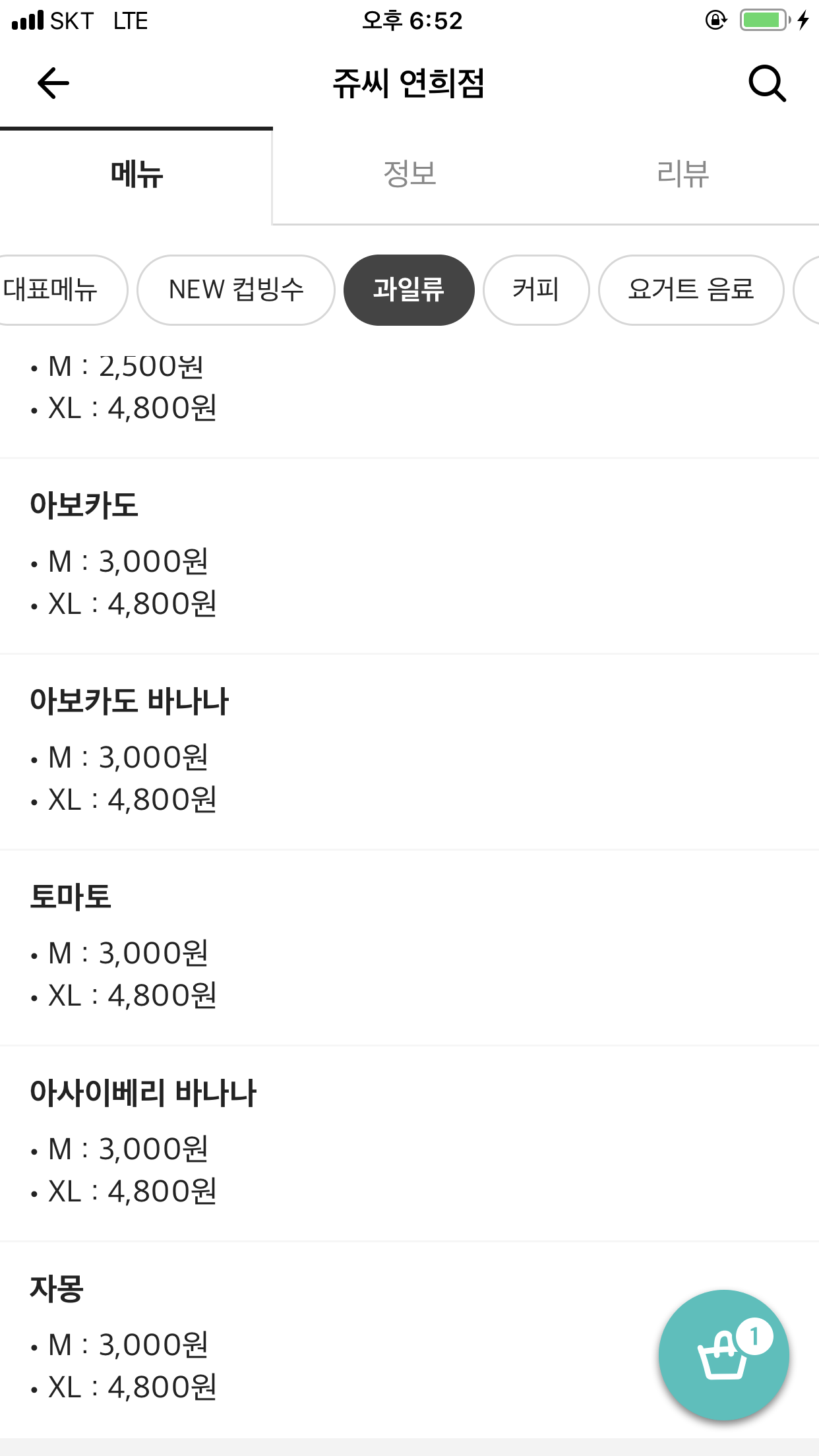 아보카도 바나나, 토마토, 아사이베리 바나나, 자몽주스 모두 M사이즈 3000원, XL사이즈 4800원이네요.