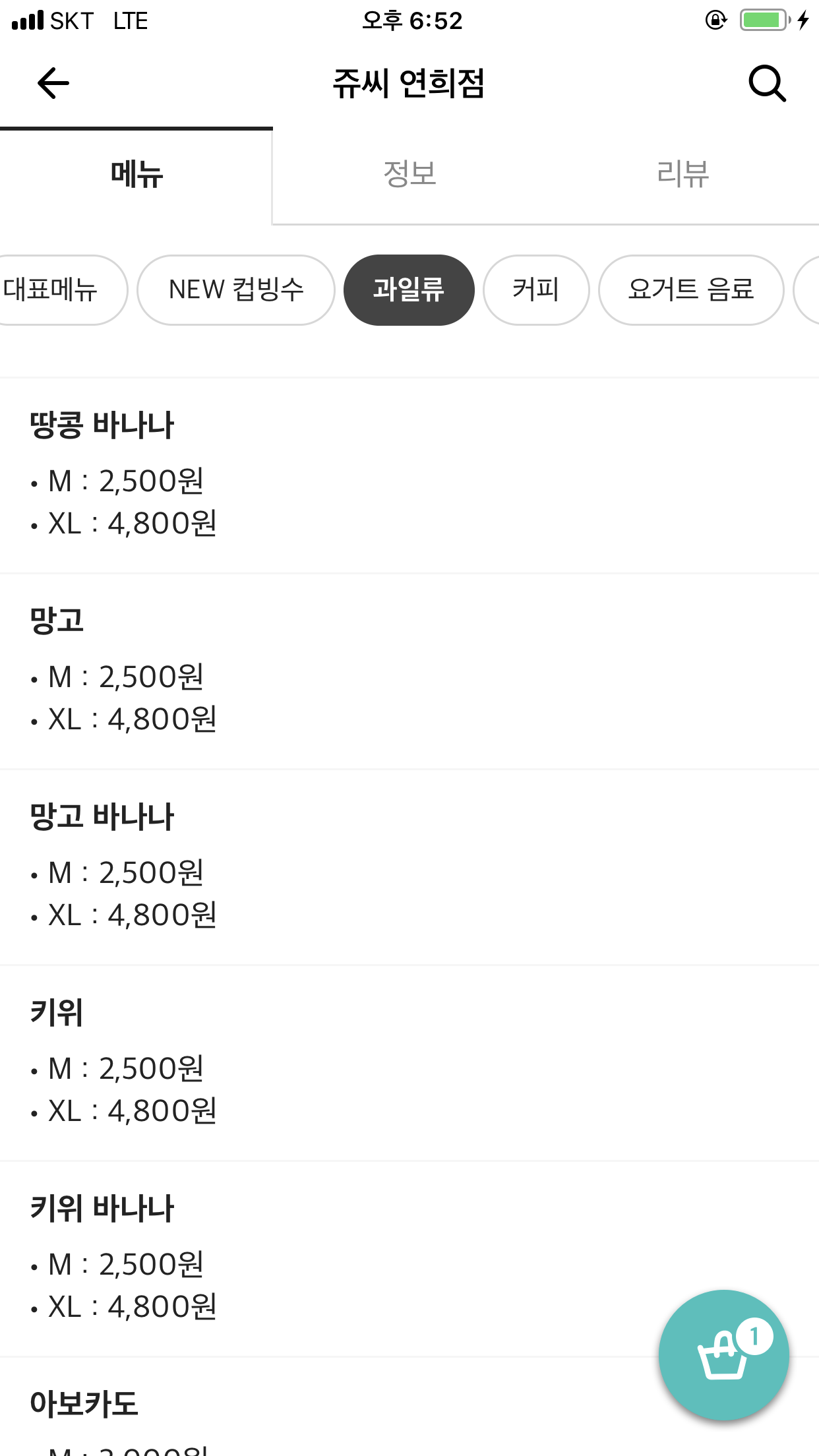 땅콩 바나나는 2500원이고요 XL는 4800원입니다 .망고랑 망고 바나나 쥬스는 각각 다른마싱니 참조하시고요, 망고=망고바나나=키위=키위바나나 주스 M, L 사이즈 가격 동일하게 2500원과 4800원입니다.