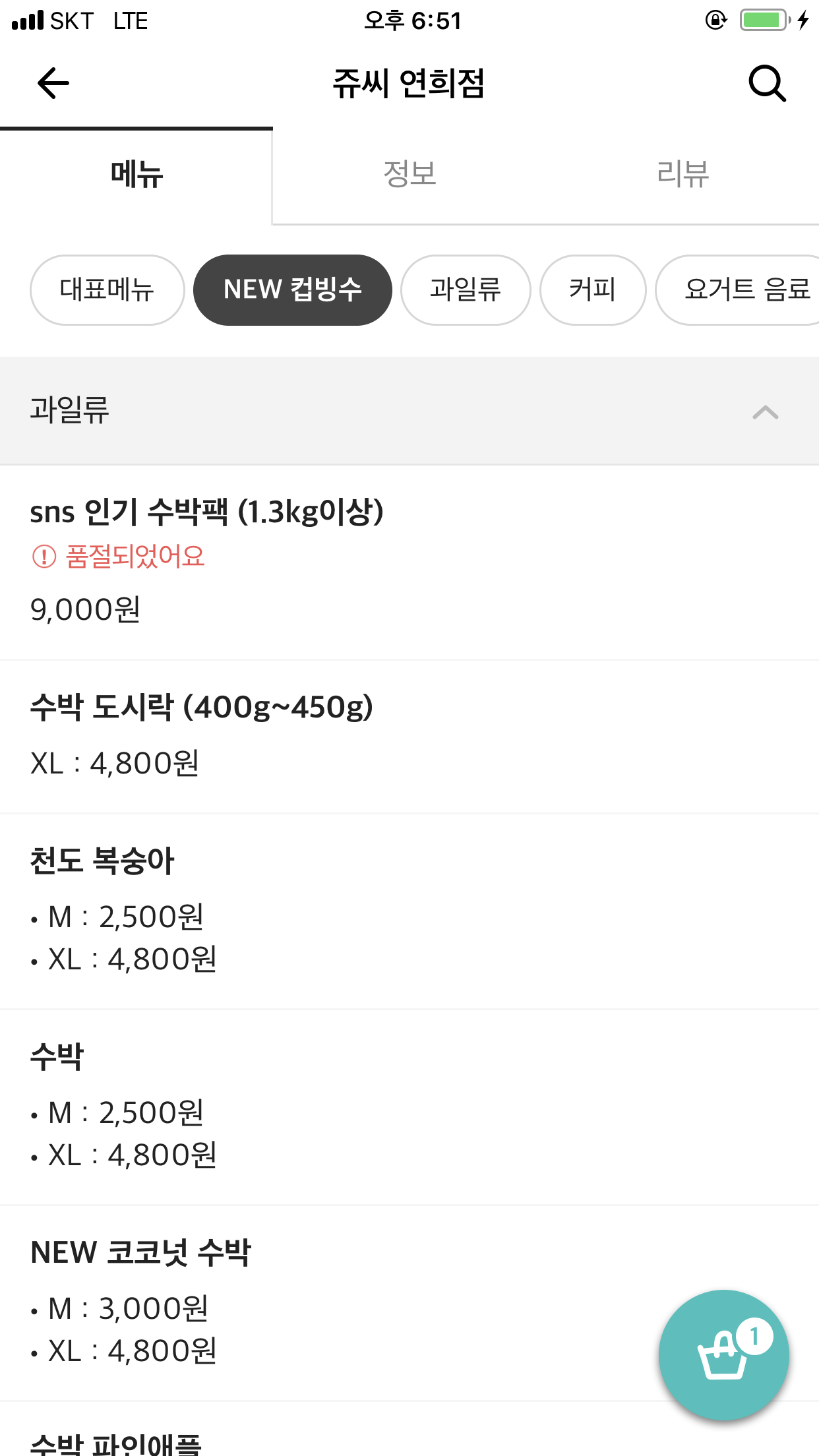 SNS인기 수박팩은 1.3kg이상이네요. 수박 도시락은 400g~450g사이인데 XL로 4800원입니다. 천도복숭아, 수박, NEW 코코넛 수박도 M사이즈와 XL사이즈 가격이 각각 다릅니다.