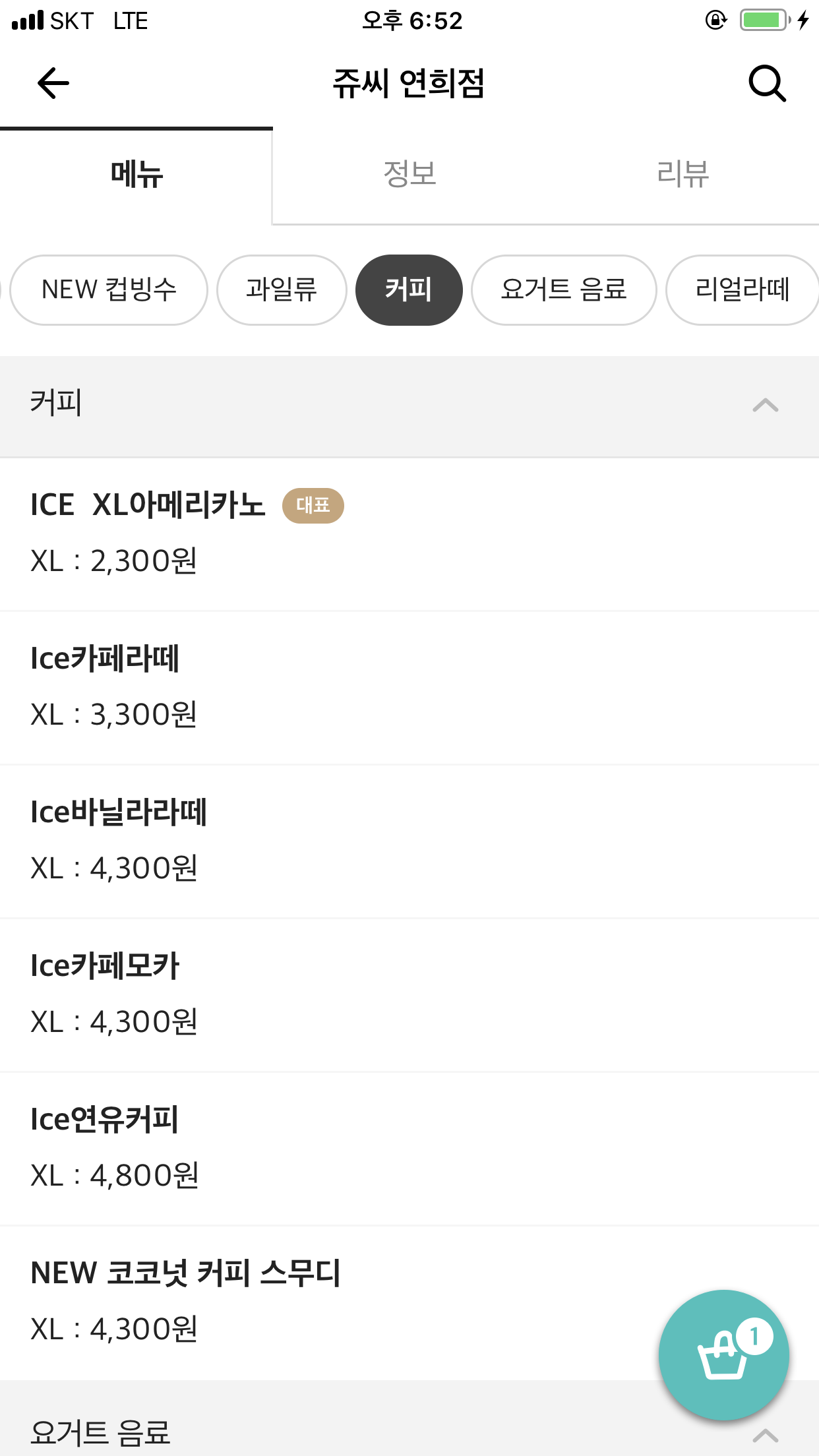 ICE XL 아메리카노 2300원, ICE 카페라떼 XL 3300원, ICE 바닐라라떼 XL 4300원, ICE카페모카 XL 4300원, ICE연유커피 XL 4800원, NEW 코코넛 커피 스무디는 XL 4300원입니다.