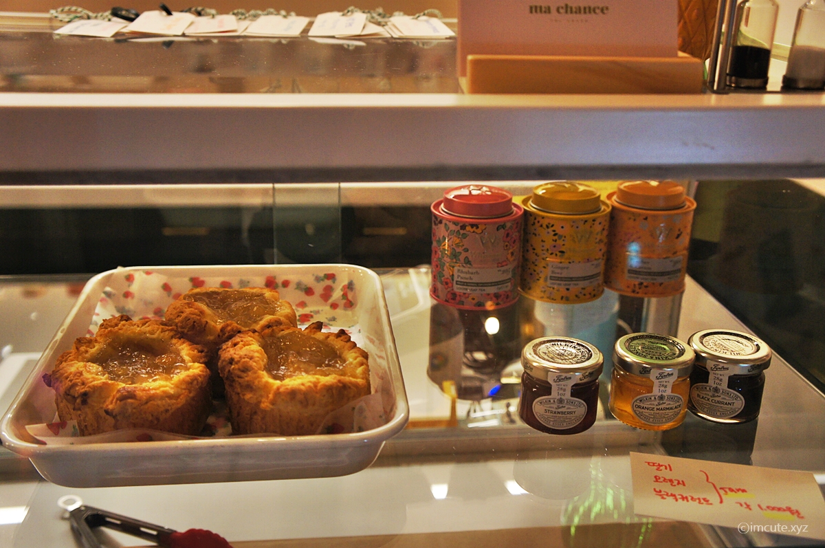 애플파이 스콘도 주문... ! 인스타그램에 마샹스 보면 SNS에 올라와 있는 사진이 많다. 꽤나 먹음직스러워 보여서 주문한 것이다. 뒤에 딸기, 오렌지, 블랙커런트 잼이 있었는데 저런거도 하나 사서 집에서 식빵이랑 먹으면 괜찮겠다 싶었다(: 나중에 홈카페를 할 때 여기서 이것저것 사가면 좋겠다 싶더라.