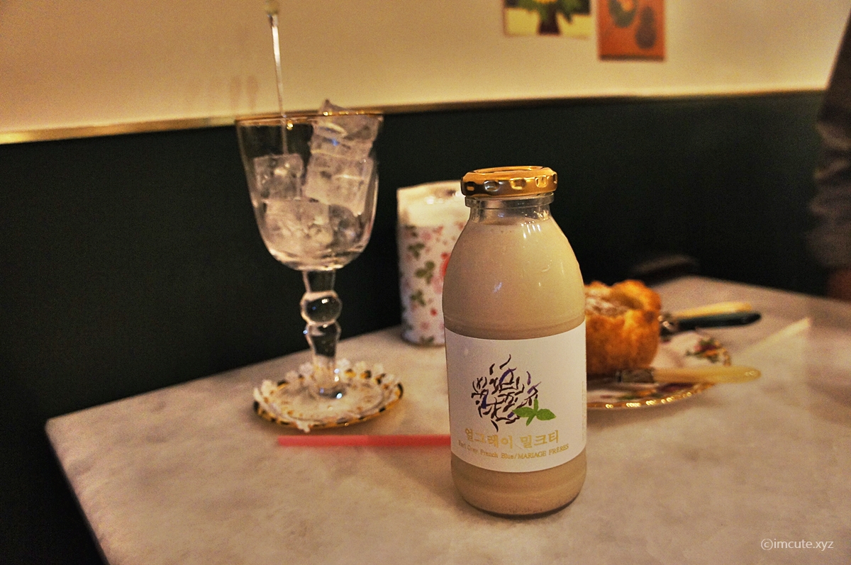 스콘이랑 밀크티 그리고 예쁜 컵~ 밀크티 전부가 한 번에 따라지지 않는 작은 컵이었고 얼음이 되게 크고 이뻤다. 식기는 영국스타일이었고 밀크티가 얼음과 잘 섞이게끔 머들러를 주시며, 빨대는 짧게 잘라주셔서 먹기에 편했다.