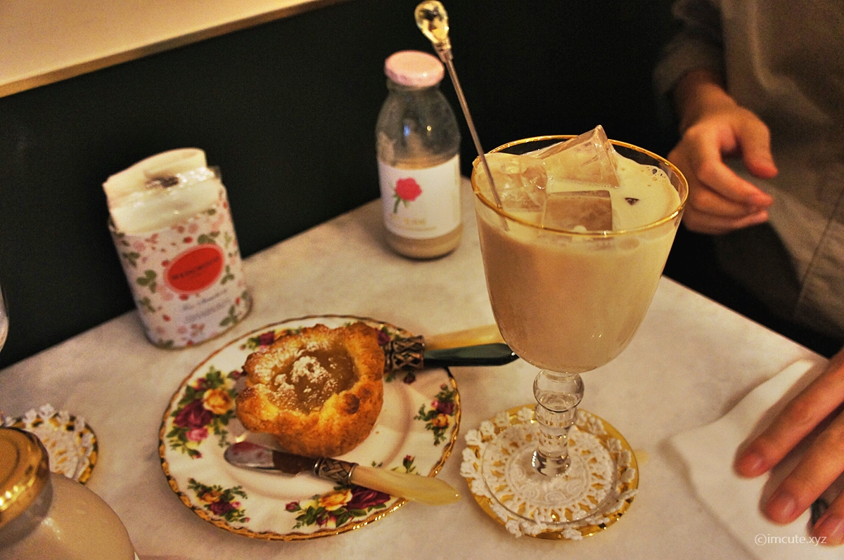 스콘이랑 밀크티 그리고 예쁜 컵~ 밀크티 전부가 한 번에 따라지지 않는 작은 컵이었고 얼음이 되게 크고 이뻤다. 식기는 영국스타일이었고 밀크티가 얼음과 잘 섞이게끔 머들러를 주시며, 빨대는 짧게 잘라주셔서 먹기에 편했다.