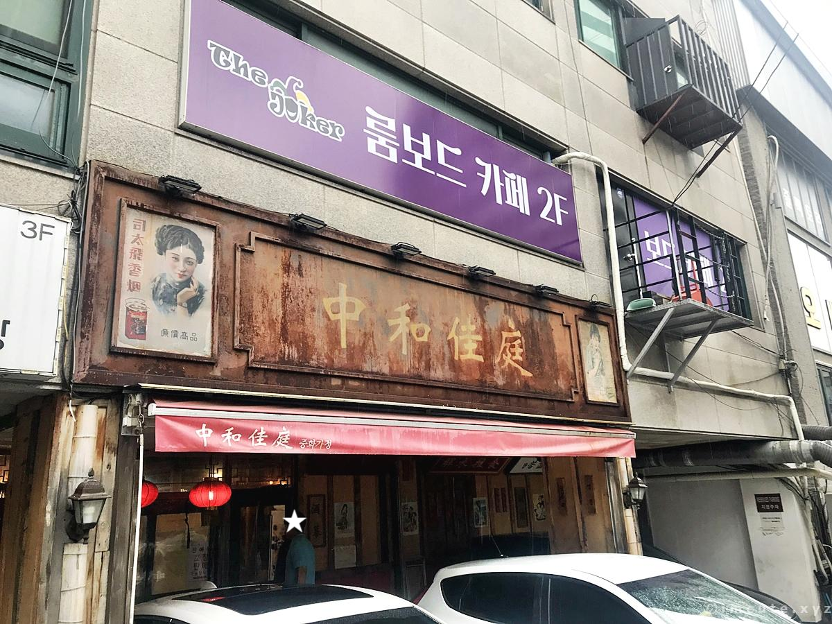 멋진 식당답게 홍대 예술의거리(...) 에 있는데요. 벌써부터 차를 끌고 와서 사람들이 많이들 먹고 있더라고요. 그러니까 홍대입구역이랑 홍익대학교의 중간, 먹자골목에서도 조금 더 들어온 곳에 위치해 있더라고요. 한문으로는 中和佳庭 이라고 써있습니다.