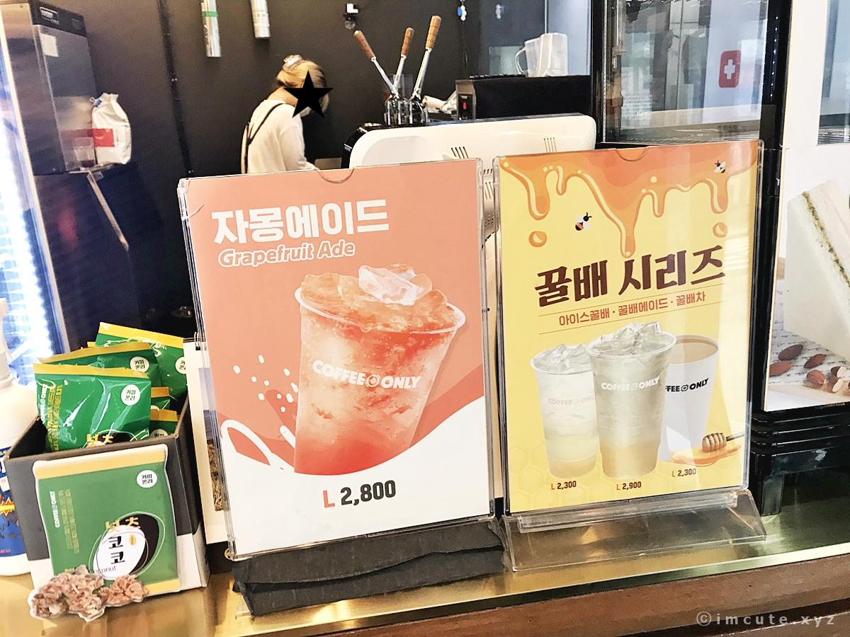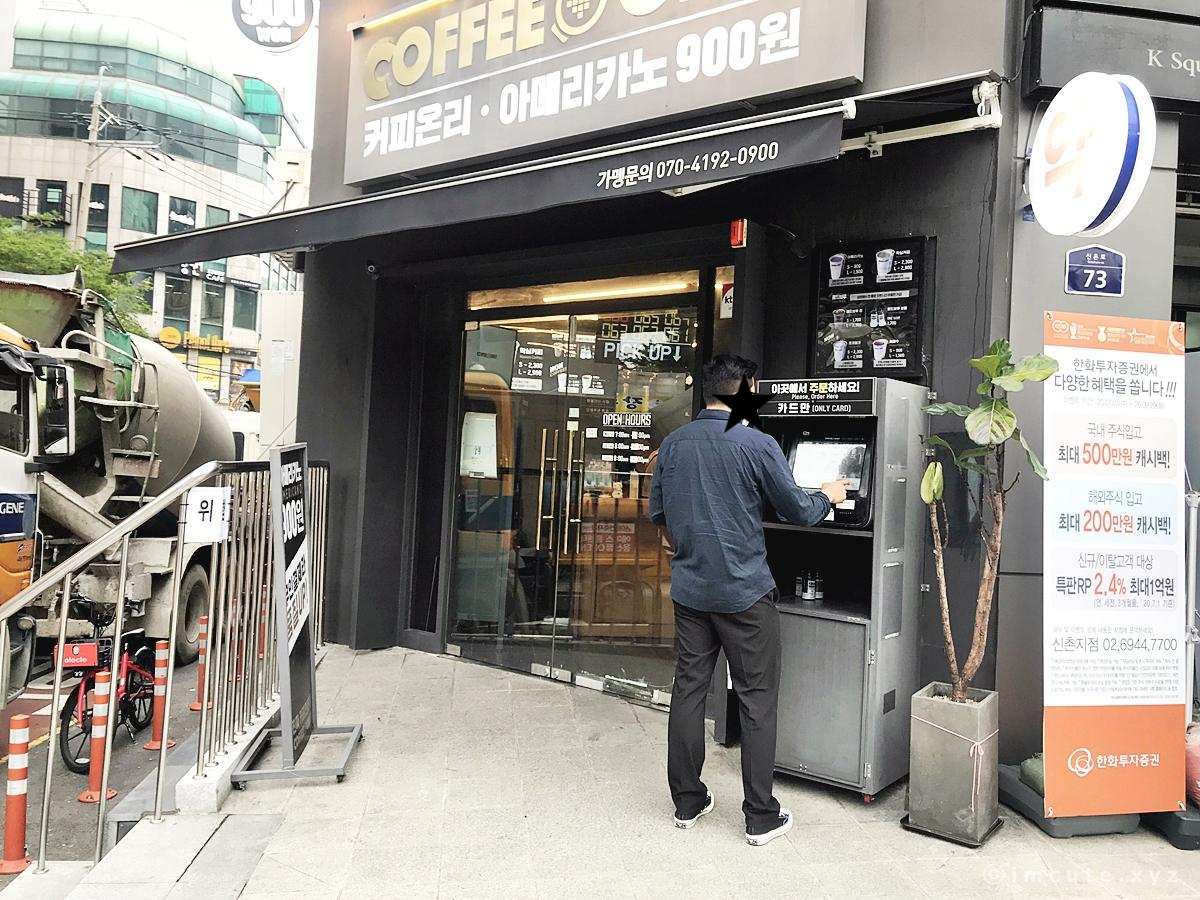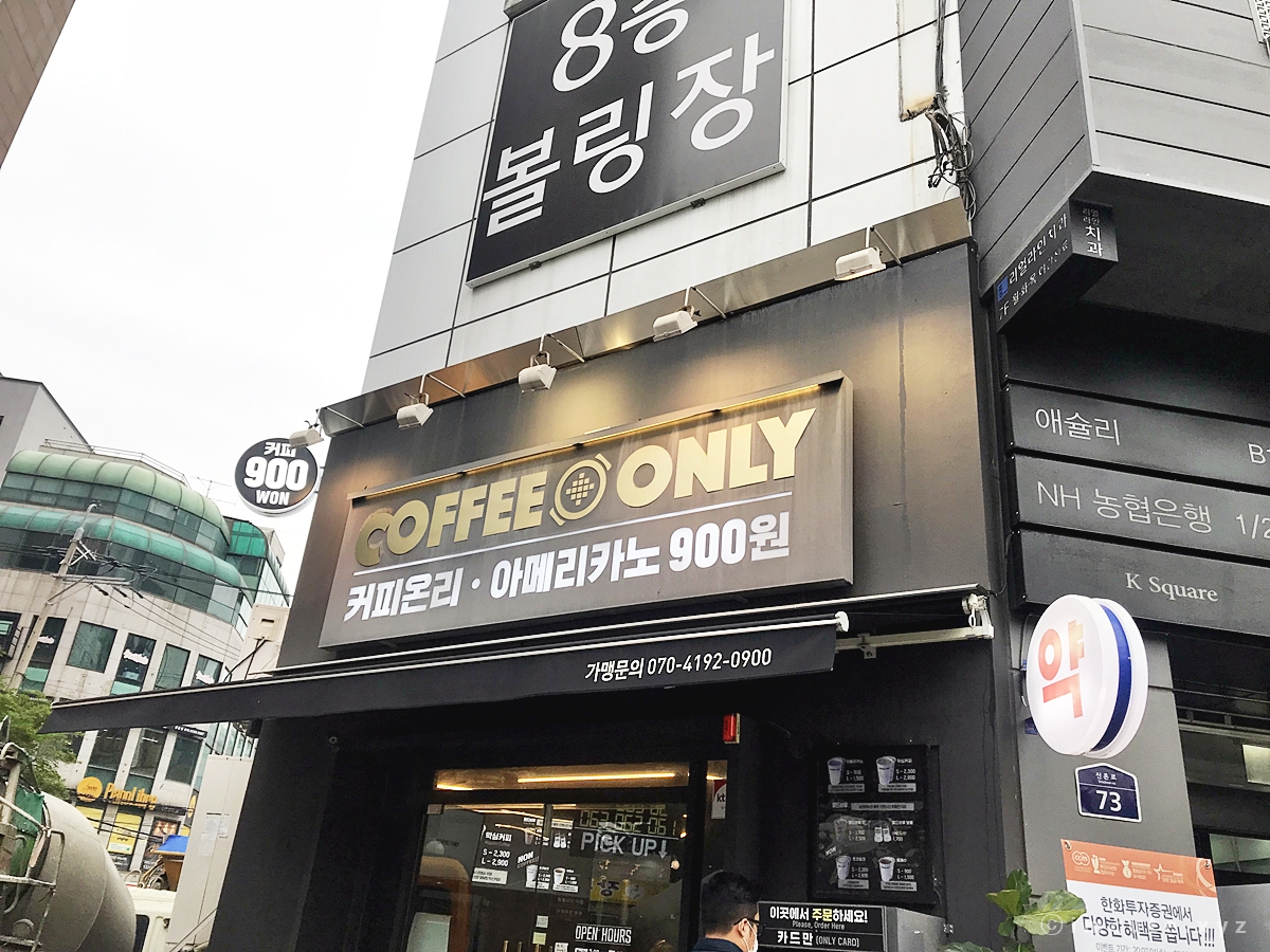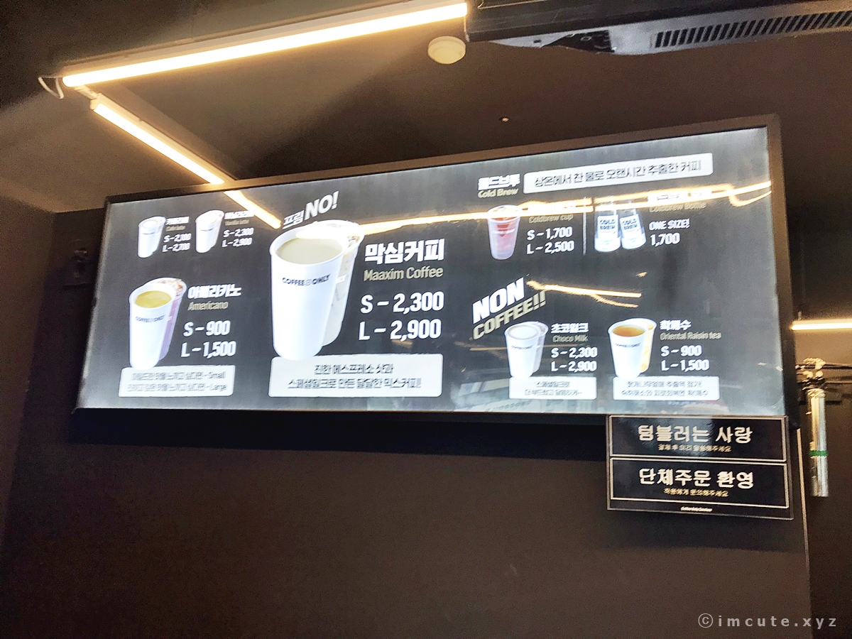 COFFEE ONLY라는 이름을 달고있는 이곳은 작은 아메리카노는 900원밖에 하지 않는 어마무시한 가성비를 자랑하는 카페입니다. 안에 내부좌석은 없고, 오로지 테이크아웃을 전문으로 하는 곳인듯 했어요.