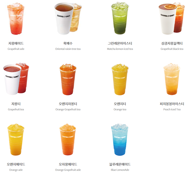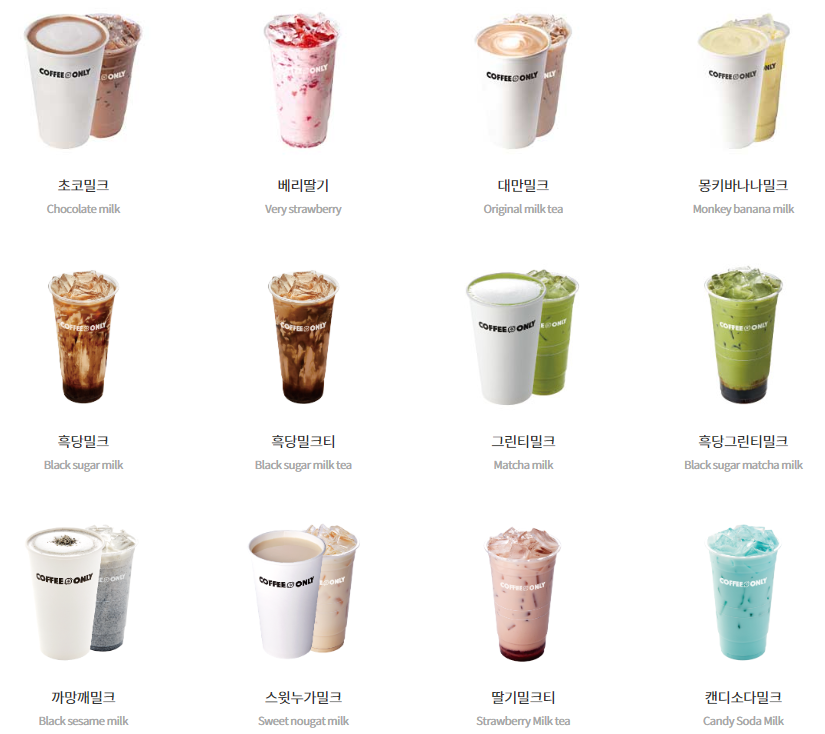 그러면, 카페 커피온리에서 즐길 수 있는 메뉴들을 보여드릴게요. 공식홈페이지에서 발췌한 거고요. 가격은 지점마다 상이할 수도 있으니 메뉴위주로 보여드릴게요.
