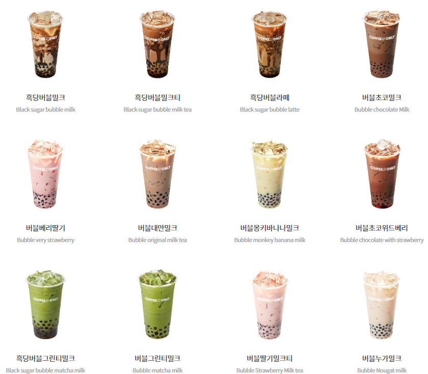 버블이나 밀크티 종류를 좋아하시는 분들이 좋아하실 듯한 메뉴!! 흑당버블밀크, 흑당버블밀킅, 흑당버블라떼 등 흑당시리즈부터 시작해서, 버블초코밀크, 버블베리딸기, 버블대만밀크, 버블몽키바나나밀ㄹ크, 버블초코위드베리, 흑당버블그린티밀크, 버블그린티밀크, 버블딸기밀크티, 버블누가밀크 가 있습니다.