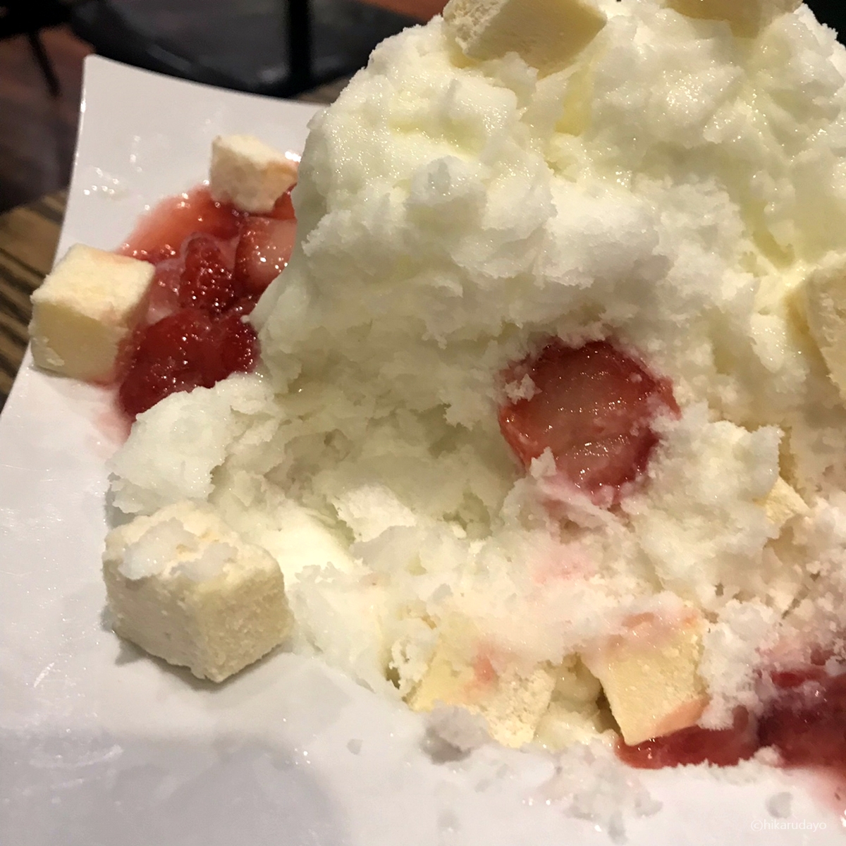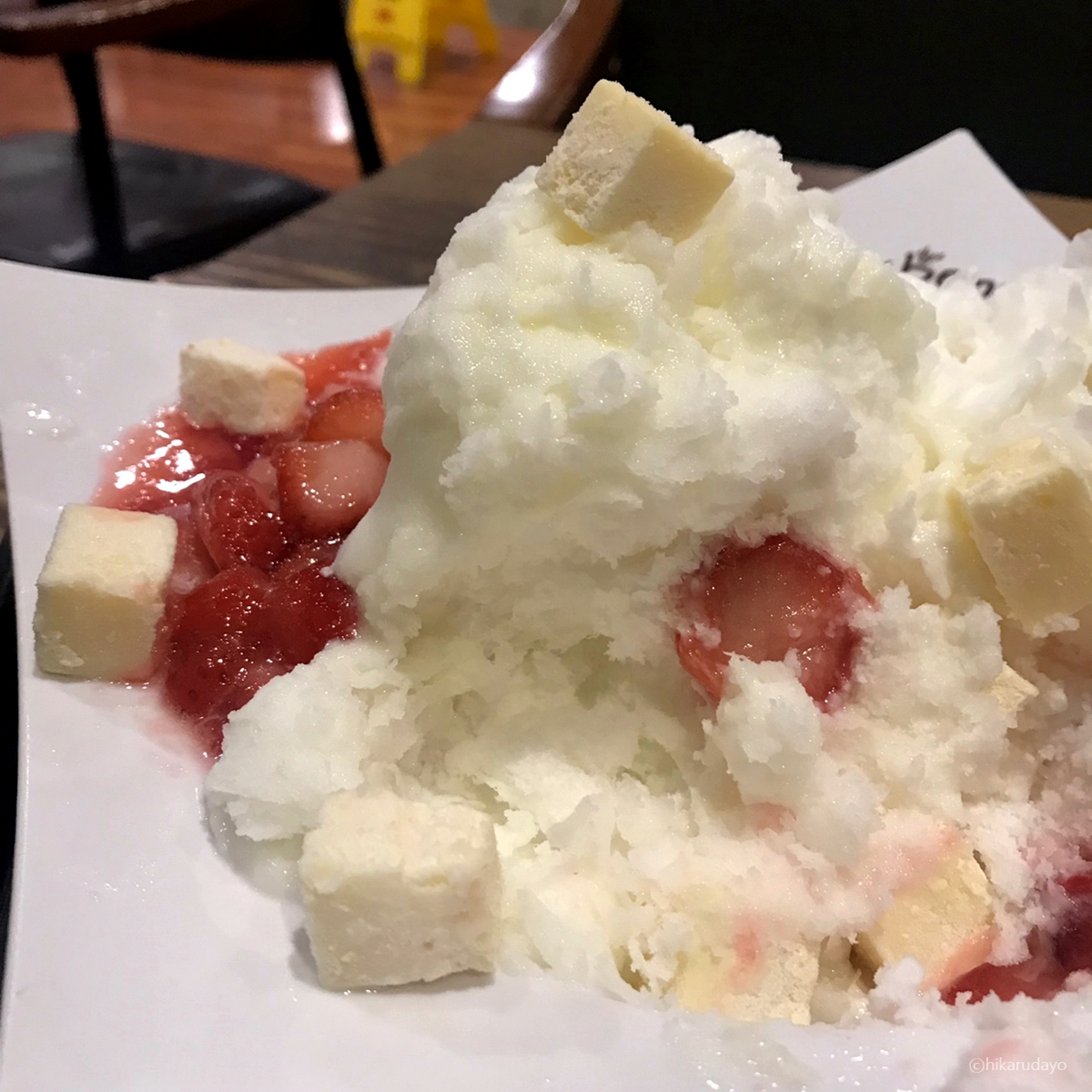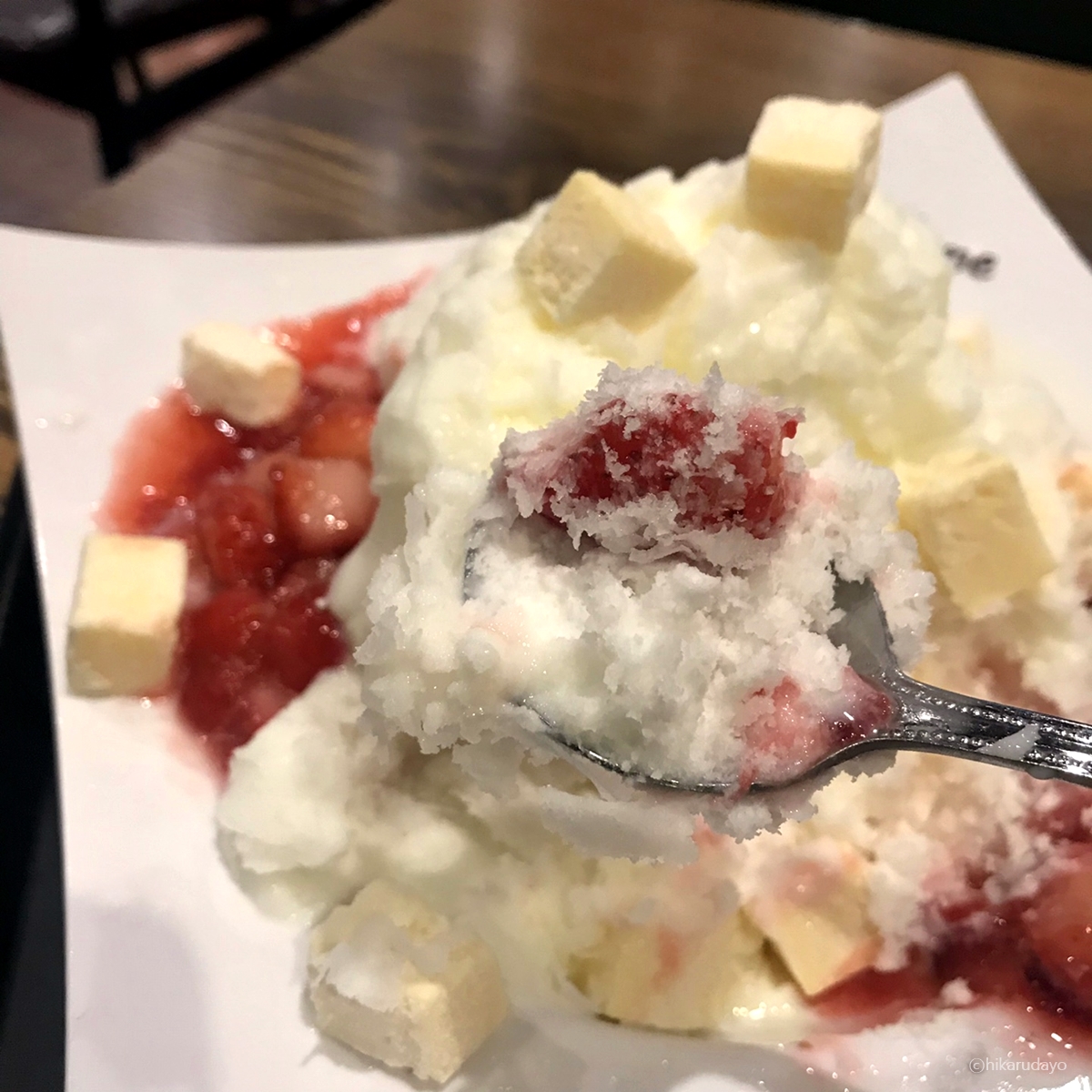 이 빙수의 특징은 눈꽃얼음이라는 점입니다. 그리고, 치즈큐브가 세상 맛있어 보이는 비주얼!! 되게 고소하고 달콤하답니다. 여러분께서도 아실지도 모르겠지만 딸기와 치즈 그리고 우유의 만남이란 절대 실패하지 않는 조합이라는 거~ 제가 먹었지만 진짜 이거는 모두에게 알리고 싶은 충동이 일고 마네요 부들부들
