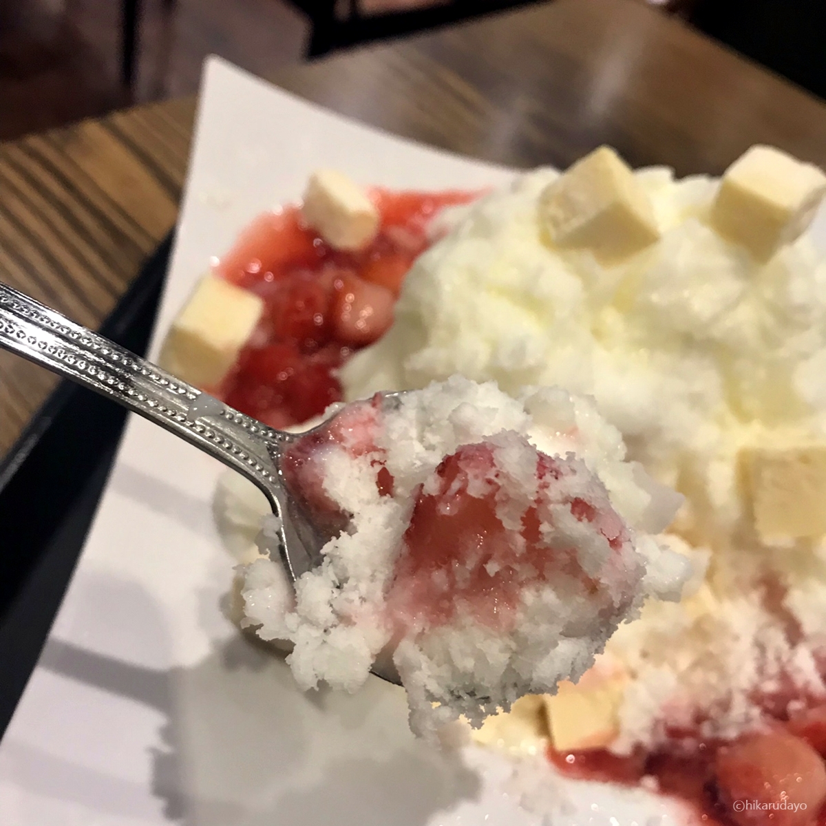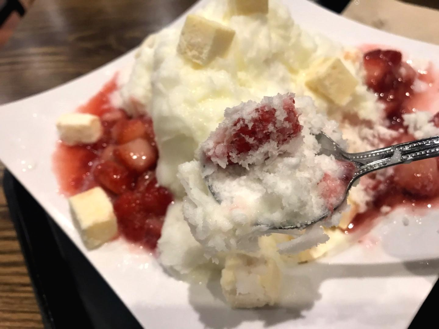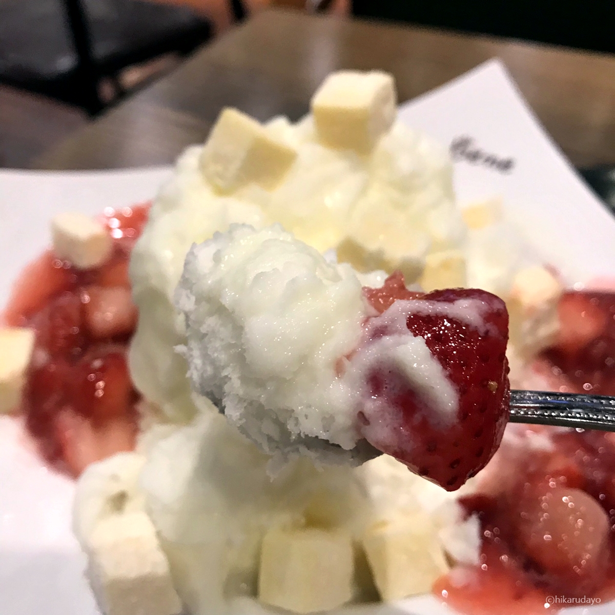 이 빙수의 특징은 눈꽃얼음이라는 점입니다. 그리고, 치즈큐브가 세상 맛있어 보이는 비주얼!! 되게 고소하고 달콤하답니다. 여러분께서도 아실지도 모르겠지만 딸기와 치즈 그리고 우유의 만남이란 절대 실패하지 않는 조합이라는 거~ 제가 먹었지만 진짜 이거는 모두에게 알리고 싶은 충동이 일고 마네요 부들부들