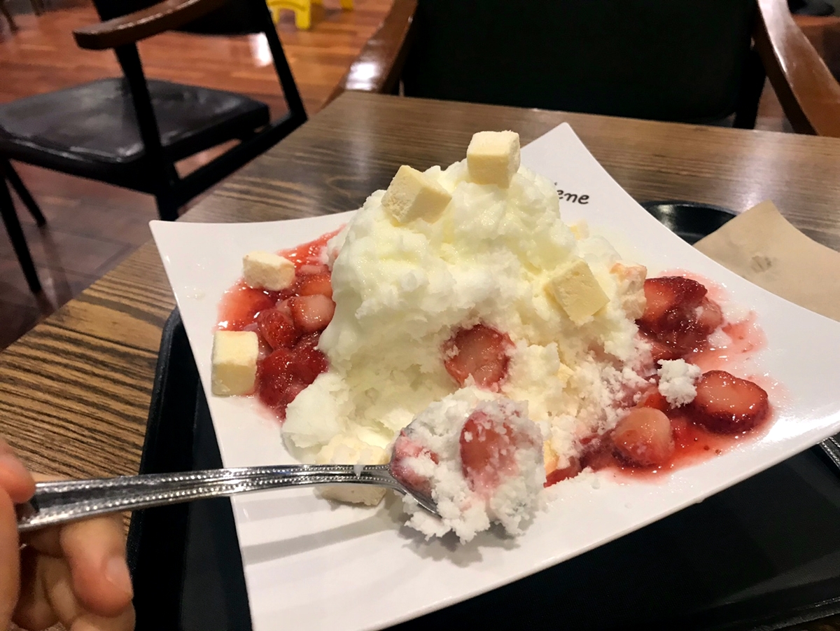 이렇게 한술 두술 떠서 먹다보니까 어느덧 금방 동났네요. 평평하고 넓은 접시 위에 주셔서 딸기 눈꽃빙수의 비주얼이 살았는데~ 아참, 딸기 빙수는 얼음이 그냥 얼음이라고 해요