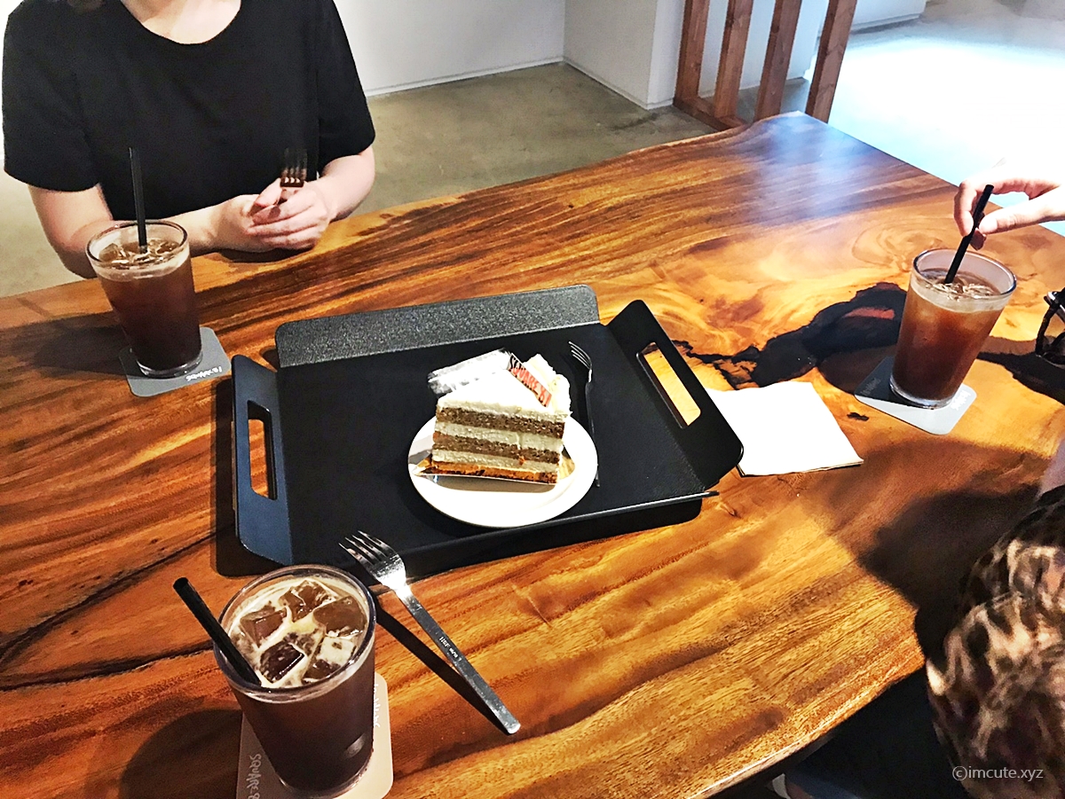 우리는 당근케이크랑, 아이스 아메리카노 3개를 시켰어요. 일단 분위기만으로도 흡족했는데 디저트도 되게 이쁘게 잘 나오죠? 컵이랑, 플레이팅 모두 다 마음에 들고 케이크 사이즈도 뚜둥하다는 것이 좋았어요. 아참, 아까 보셨다시피 빵공장형 카페여서 빵도 먹고싶긴 한데 이미 밥을 배부르게 먹고 온터라 밥까지 다 못시킨건 심히 아쉽더라고요. 다음엔 무조건 빵이랑 먹어볼겁니다. 브런치 식으로다가 말이죠.