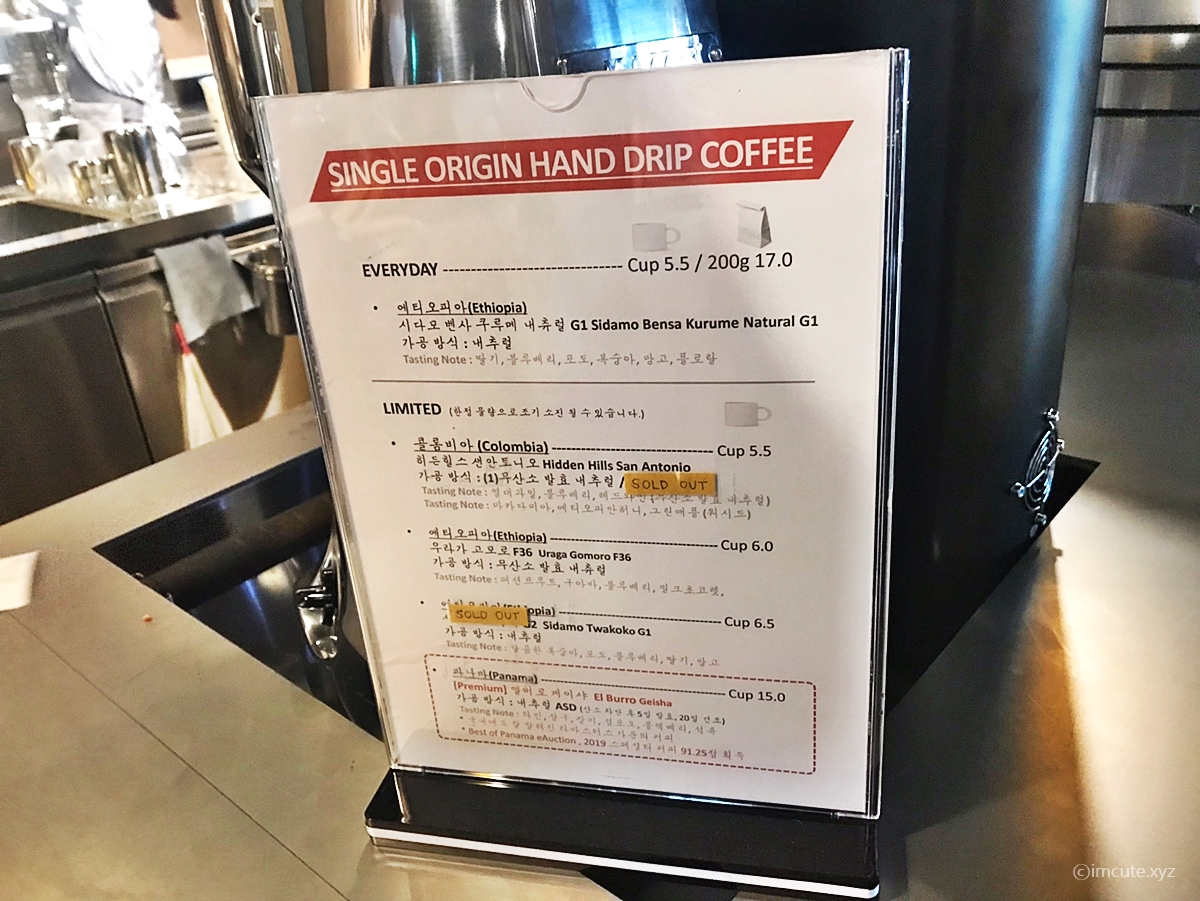 이 집은 커피메뉴에도 많이 신경을 쓴거 같은데요, 싱글 오리진 핸드드립 커피도 취급하고 있습니다. 원두가 여러가지였는데요 everyday메뉴로 에티오피아 원두가 있었고요 limited메뉴로는 콜롬비아, 에티오피아 등이 있었고 솔드아웃 된 메뉴도 보였ㅅ브니다. 파나마가 제일 가격이 비싸네요.