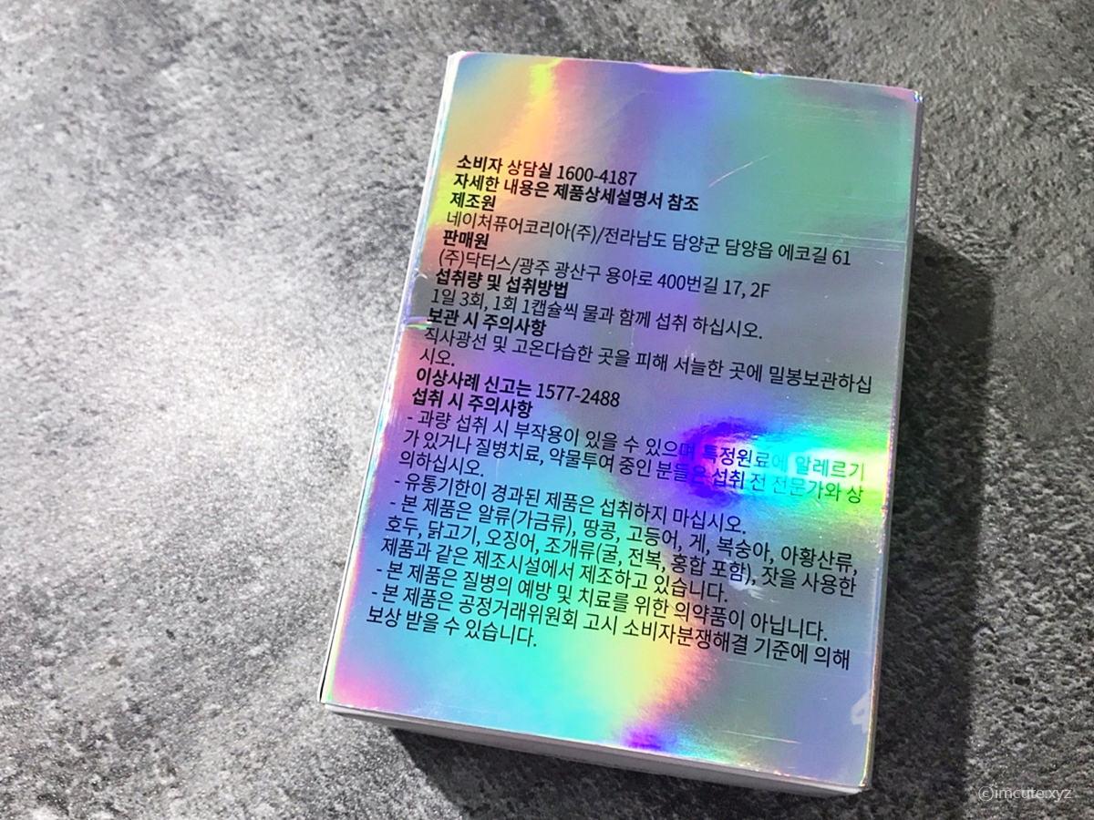 1일 3회, 1회 1캡슐씩 먹으면 된다고 써 있습니다. 드실 시간에 알람 맞춰 놔도 좋을것 같습니다. (물론 약은 아니지만 말이죠) 또한, 제조원, 판매원이 써있습니다. 제조원은 네이처퓨어코리아라는 회사이고 판매원은 닥터스인 모양입니다. 개인적으로는 잘 모르는 회사이름이었습니다.