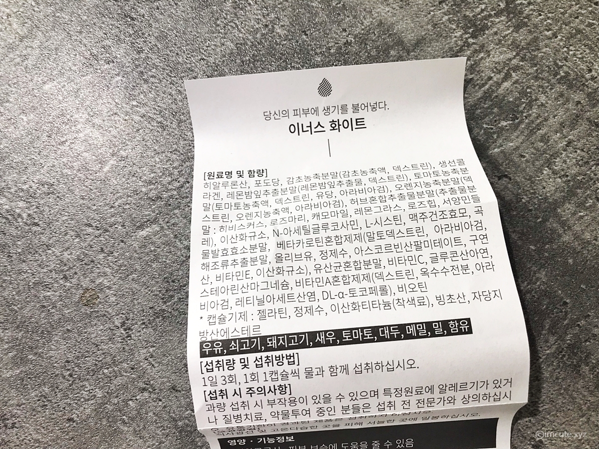 이너스 화이트 설명서입니다. 원료명 및 함량과, 섭취량 및 섭취방법, 섭취 시 주의사항이 나와있엇습니다. 일단 이런거 섭취할 시에는 너무 많이 드시지 마시고 제품에 무엇이 들어가 있는지 꼼꼼하게 살펴보신 후 알러지 있으신 분들은 주의하여 드셔야죠. 알레르기 때문에 문제가 발생하지 않게 미리 확인해주시기 바랍니다.