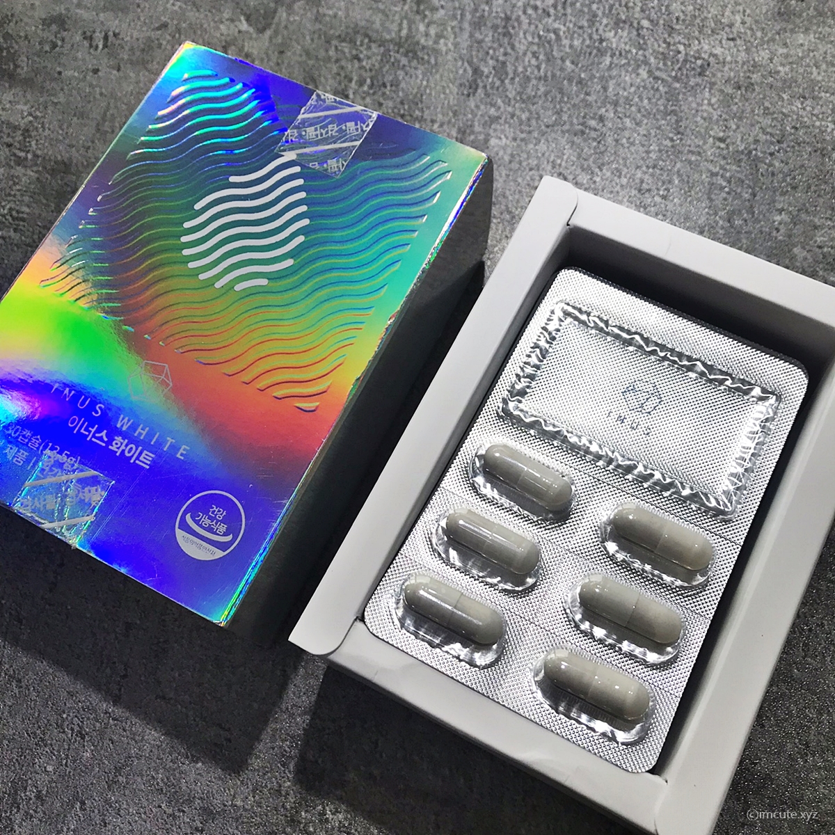 은빛 반짝이는 통에 담긴 이 제품이 이너스 화이트입니다. 챙겨먹는 사람들은 잘 챙겨먹는게 이너뷰티 아이템인데요 저는 솔직히 성격상 잘 챙겨먹는 스타일은 아니라....