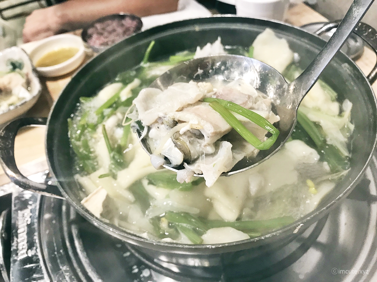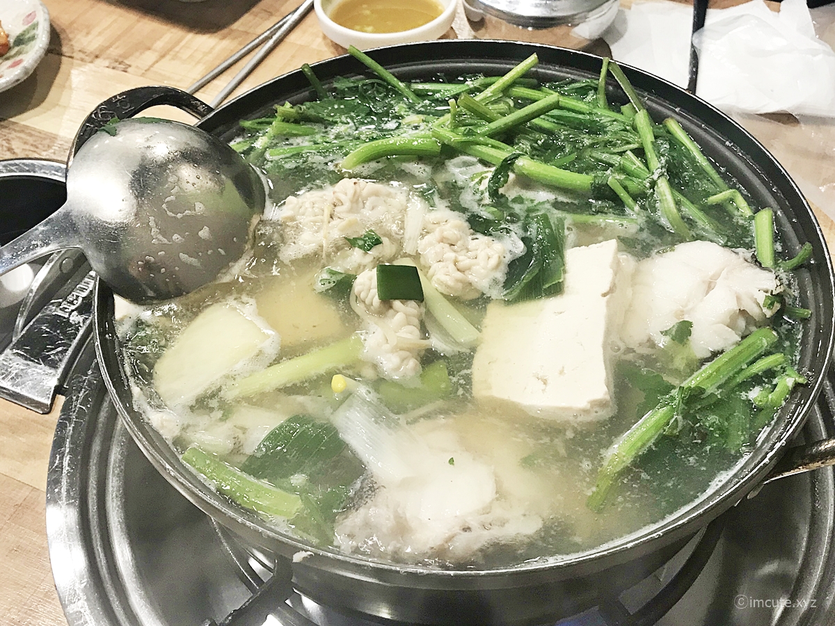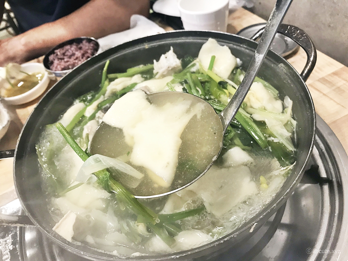 저는 매운 탕만 맛있는줄 알았는데 하나도 자극이 없으면서도 맑은 국물이 속을 확 풀어지게 만들어 주었습니다. 밑에 보이지 않지만 건더기가 상당하고요 안에는 두부도 있습니다. 국물이 원체 맛있으니 꼭 수제비를 추가하여 드시길...