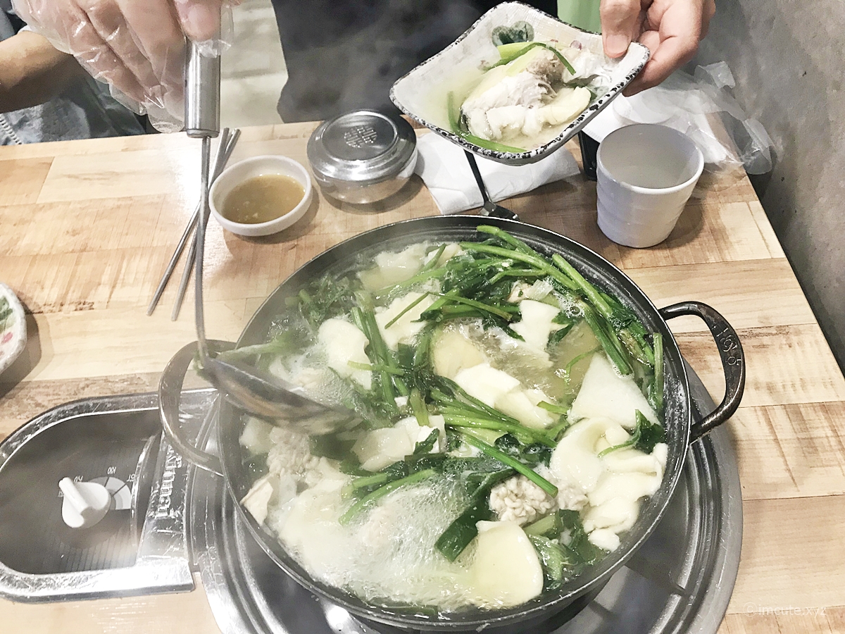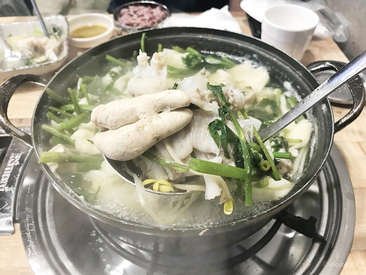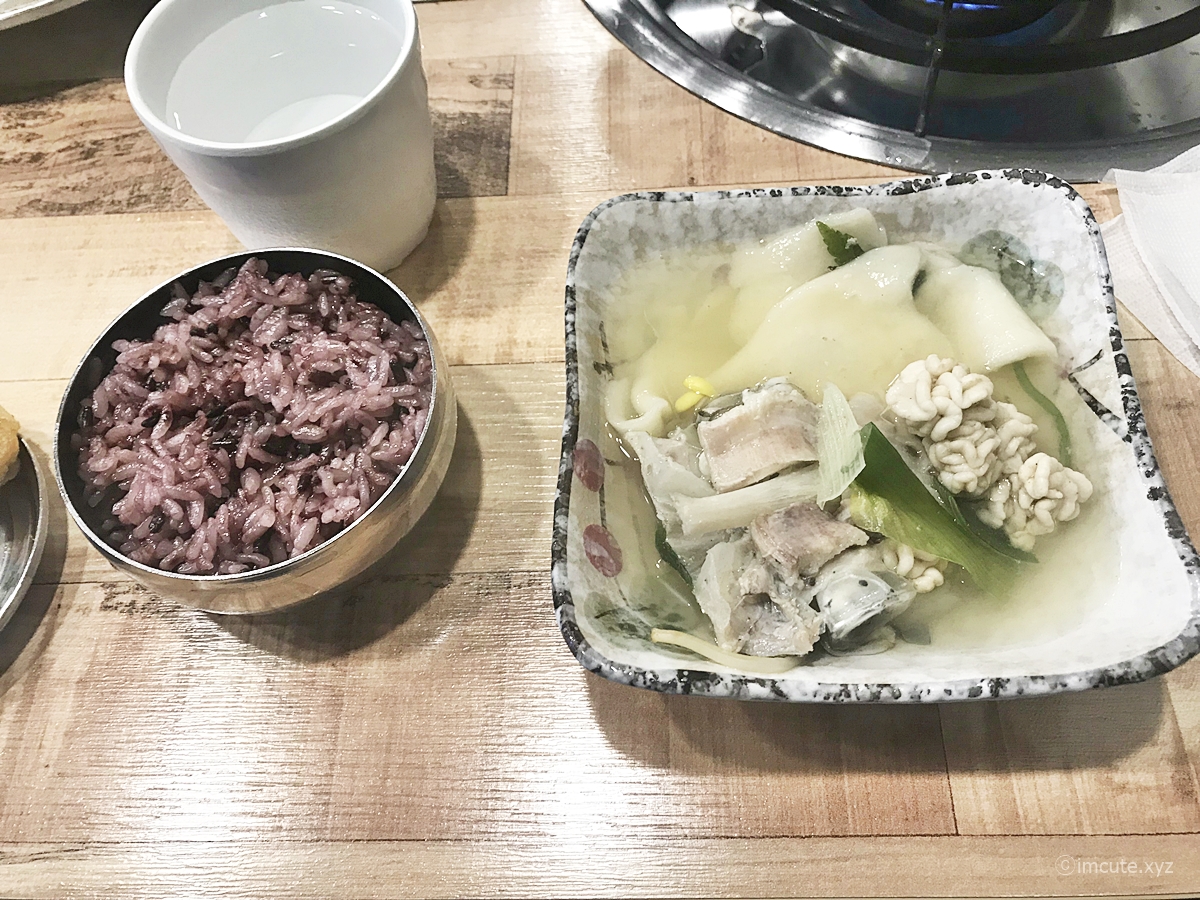저는 매운 탕만 맛있는줄 알았는데 하나도 자극이 없으면서도 맑은 국물이 속을 확 풀어지게 만들어 주었습니다. 밑에 보이지 않지만 건더기가 상당하고요 안에는 두부도 있습니다. 국물이 원체 맛있으니 꼭 수제비를 추가하여 드시길...