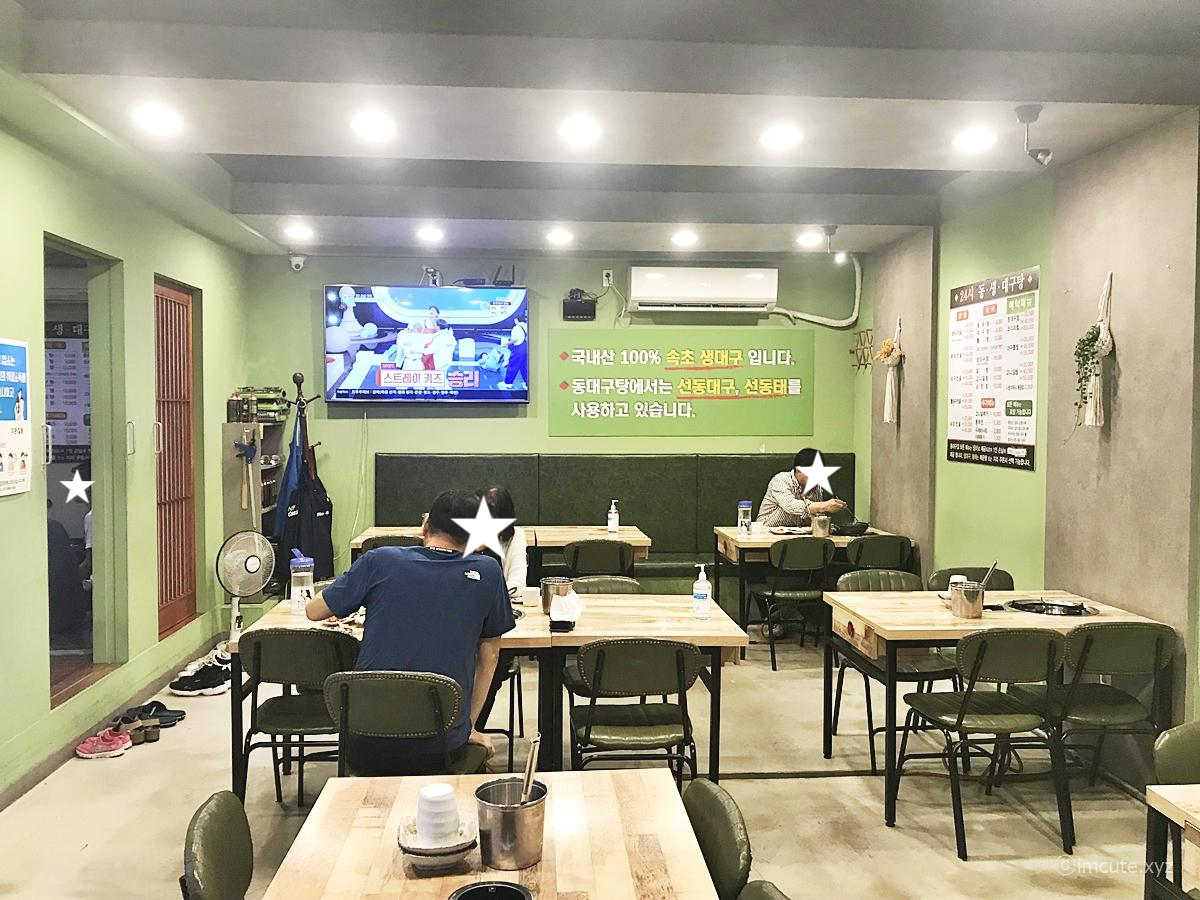 내부는 초록색 인테리어가 더욱더 음식을 맛있게 느껴지게 합니다. 꽤나 깔끔하지요. 국내산 100% 속초 생대구를 사용해서 음식을 한다 하네요. 동대구탕에서는 선동대구, 선동태를 사용한다고 명시되어 있어서 양심이 느껴지는 가게입니다. 실제로 사장님을 마주할수 있었는데요 웃으며 맞이해주시니 정말 선한 영향력이 느껴지는 분이셨습니다. 안에 자리도 또 있어서 회식장소로도 일품인 가게인듯요.