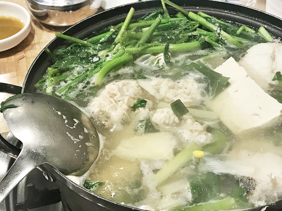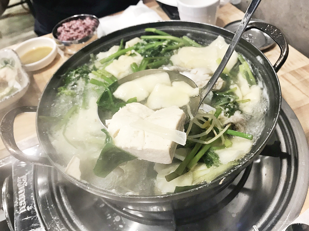 저는 매운 탕만 맛있는줄 알았는데 하나도 자극이 없으면서도 맑은 국물이 속을 확 풀어지게 만들어 주었습니다. 밑에 보이지 않지만 건더기가 상당하고요 안에는 두부도 있습니다. 국물이 원체 맛있으니 꼭 수제비를 추가하여 드시길...