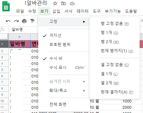 문서 관리할때 회사에서 구글 스프레드시트로 공유를 많이 한다. 같이 수정할 수 있기 때문이다. 엑셀이랑 비슷한 기능도 많아서 정말 요긴해서 팀플하는 대학생들도 많이 쓴다. 근데, 틀고정을 안하면 문서가 어지러워질 수 있기 때문에 행 고정까지 해 주는것은 문서정리에서 필수요소이다.