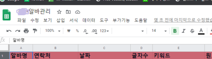 나는 알바생 관리를 구글 스프레드시트로 하고 있는데, 알바명부터 연락처 및 개인정보를 쭉 적어놓고 정렬기능을 사용하려고 했다. 입금이 완료되면 이사님이 직접 체킹을 해주시는 방식이라 이렇게 시트를 공유하여 처리하기로 했다.