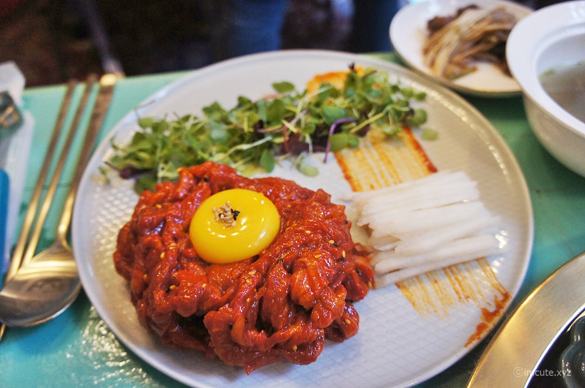 육회입니다. 기본적으로 간장이랑 된 육회는 많이 먹어봤는데 살짝 고추장으로 된거같은 육회맛~ 그리고 배랑 잘 섞어 먹습니다. 노른자도 딱 깨서 잘 섞어줍니다.