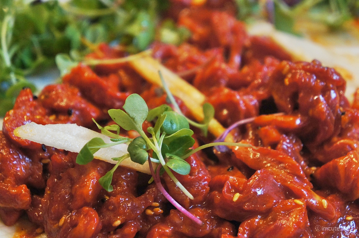 육회입니다. 기본적으로 간장이랑 된 육회는 많이 먹어봤는데 살짝 고추장으로 된거같은 육회맛~ 그리고 배랑 잘 섞어 먹습니다. 노른자도 딱 깨서 잘 섞어줍니다.