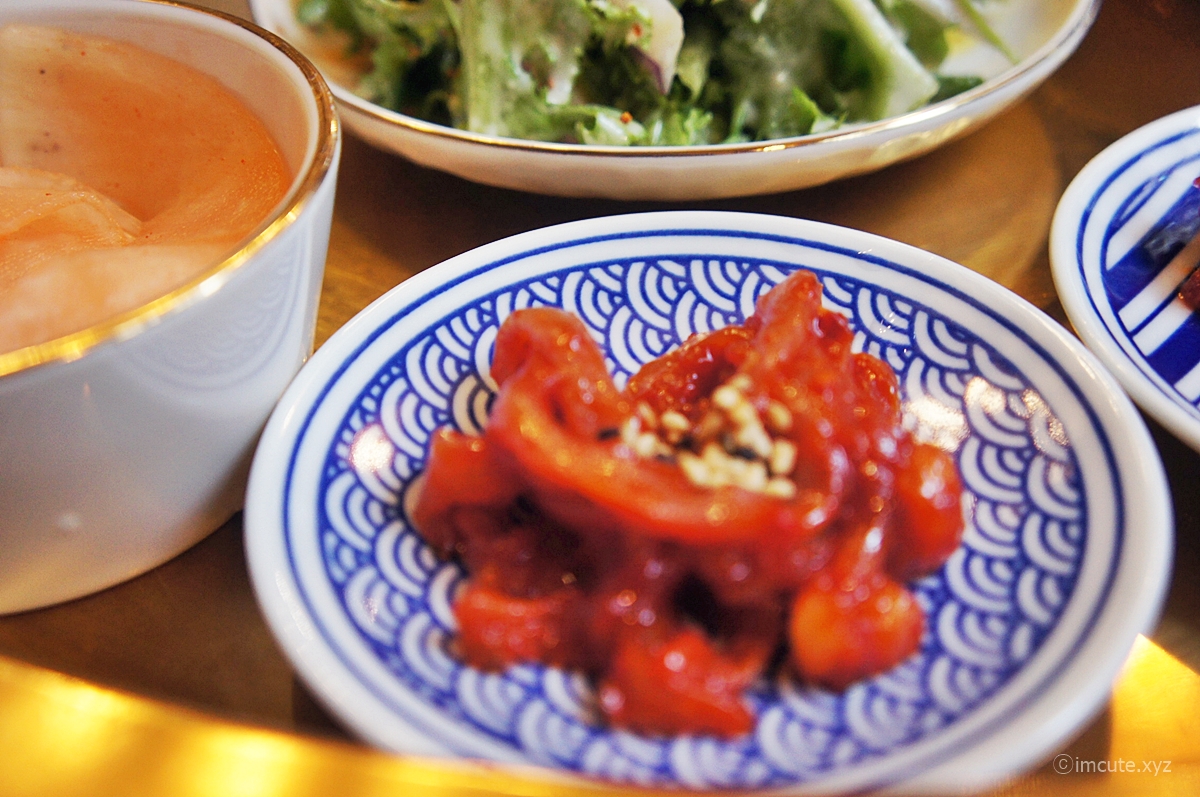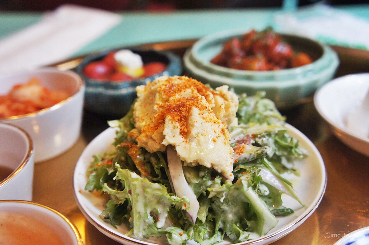 밑반찬입니다. 감자샐러드와 토마토&리코타치즈샐러드 그리고 젓갈등의 반찬이 보입니다. 기본반찬이지만 너무 수려하고 가운데 놓여져있는 샐러드는 이태리 음식같았습니다. 감자는 전분이랑 섞어져서 차지더라고요. 엄청 쫀득쫀득~ 나중에 저도 감자샐러드에 전분을 넣어서 이렇게 만들어봐야겠습니다. 모두, 모양이 다가 아닌 반찬이었습니다.